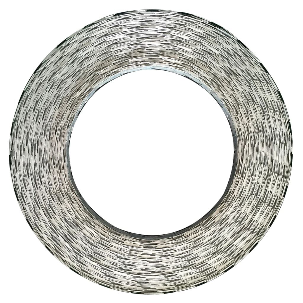 This set of 2 razor wires, suitable for all types of outdoor use, will be a perfect choice for protecting your garden or commercial property. It could even be used to secure military sites, prisons and government agencies. It is ideal for commercial as well as residential use. The sturdy barbed wire, which spreads to a length of 100 m, can be wound around the top of your garden fence for added security. The design with blades keeps unwanted guests out of your garden. Made of high-quality galvanised steel, our razor wire is weather- and water-resistant, and highly durable.
