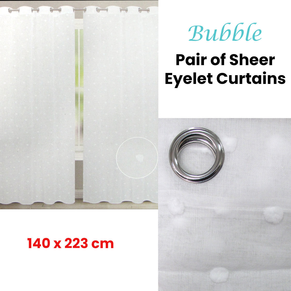 You next home makeover should not break the bank. A simple accent to you window with this minimalist Bubble White Pair of Sheer Eyelet Curtains 140 x 223cm each should do the trick. This eyelet curtain features a classic lace design in white colour tone that will easily fit with most existing home interior. It is made from quality and easy care Polyester fabric.