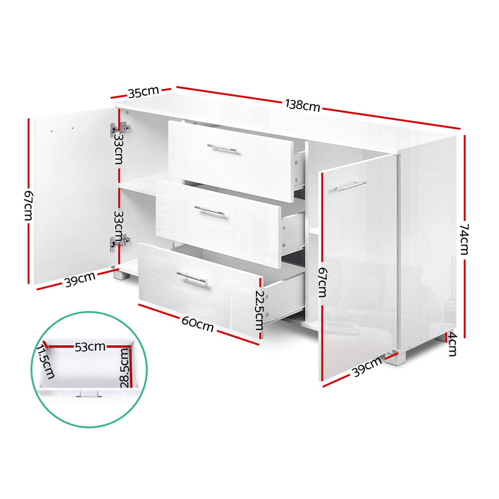 $203.97Simply designed with a high gloss finish, this buffet sideboard is great for storage and the perfect furniture to bring a modern style to your home. The practical design consists of three drawers and two cupboards, be it your dinnerware or books and magazines there is surely plenty of storage space. It features MDF/particle board panels with anti-rust coated metal draw runners and contemporary aluminium round handles. An elite in quality and design, it is the perfect additional to every home.
