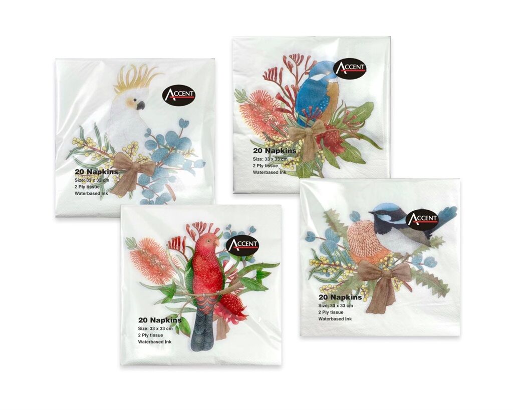 What you get:  bulk 960 Native Bird Napkin 2ply Assort 33cm