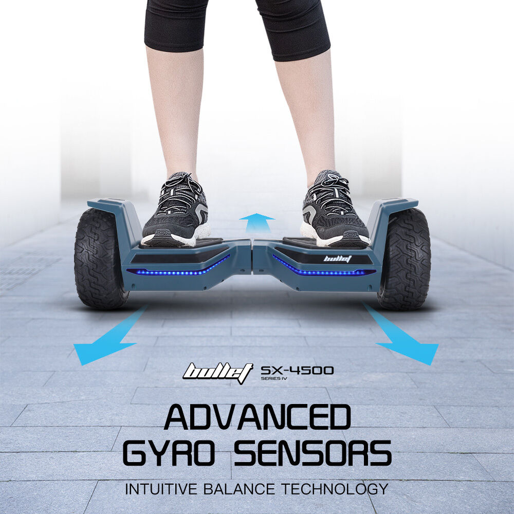 Experience a next level hoverboard with the state-of-the-art Bullet SX-4500. Its high-speed chipset reacts instantly to your bodys movements, offering highly responsive acceleration, turning, and reversing.