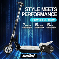 $225.59This Bullet electric scooter is the definition of style, and has performance to back the looks. The 140 watt motor means smooth exhilarating acceleration, and she can cruise along at speeds of up to 15km/h - fast enough for maximum fun, without creating hectic situations.