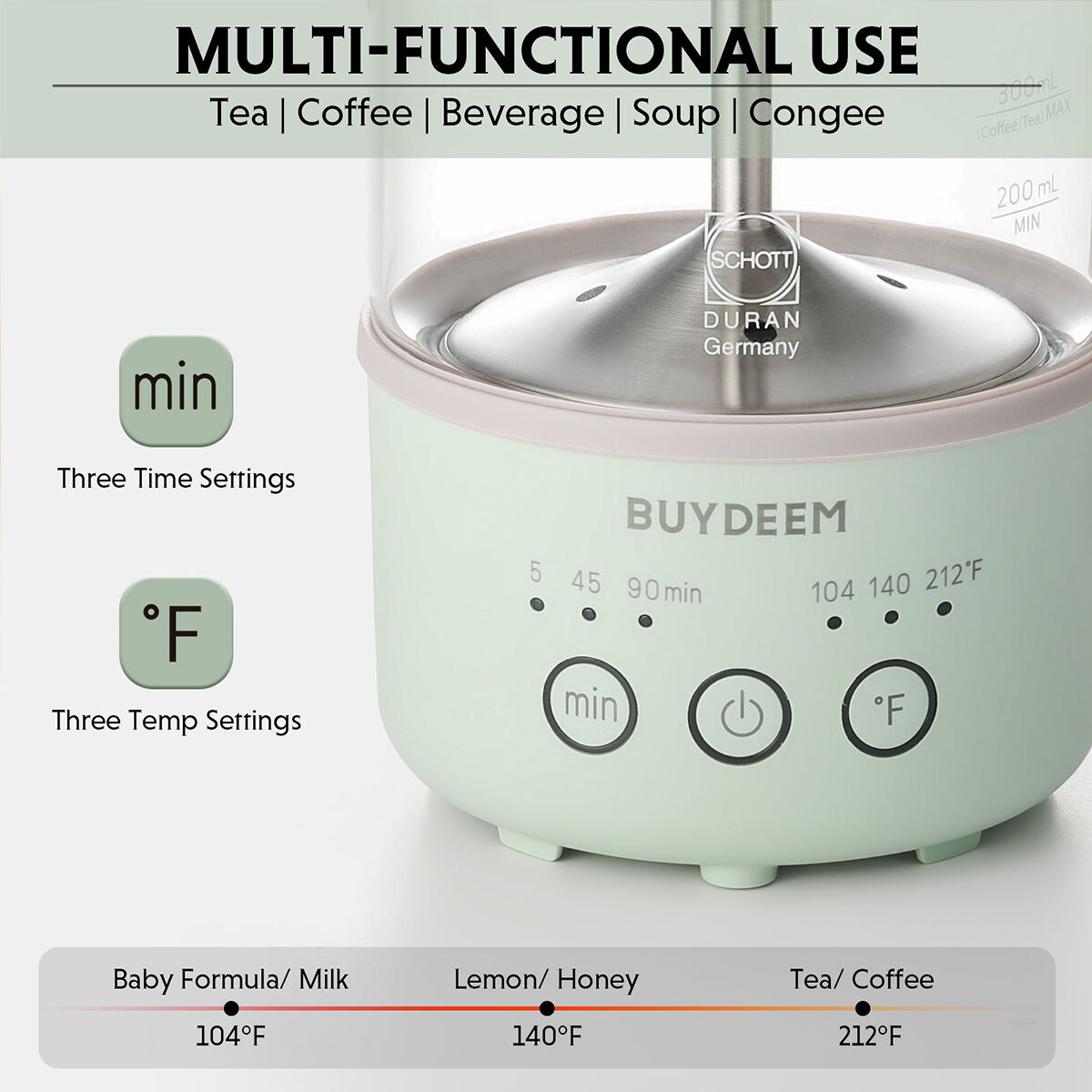 BUYDEEM K32 Tea/Coffee Maker's suitable ultralight design allows for easy portability, catering to diverse settings like dorms, offices, and camping sites.Featuring intuitive temperature control and safety features like anti-dry protection, the kettle guarantees precise heating and durability with its high-quality materials, making it a versatile and reliable choice for everyday use.
