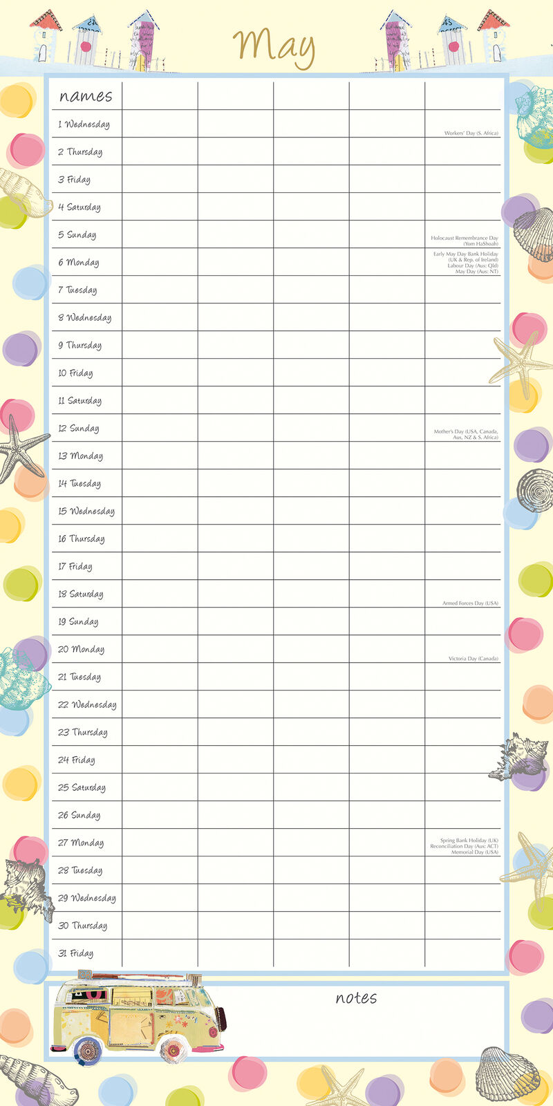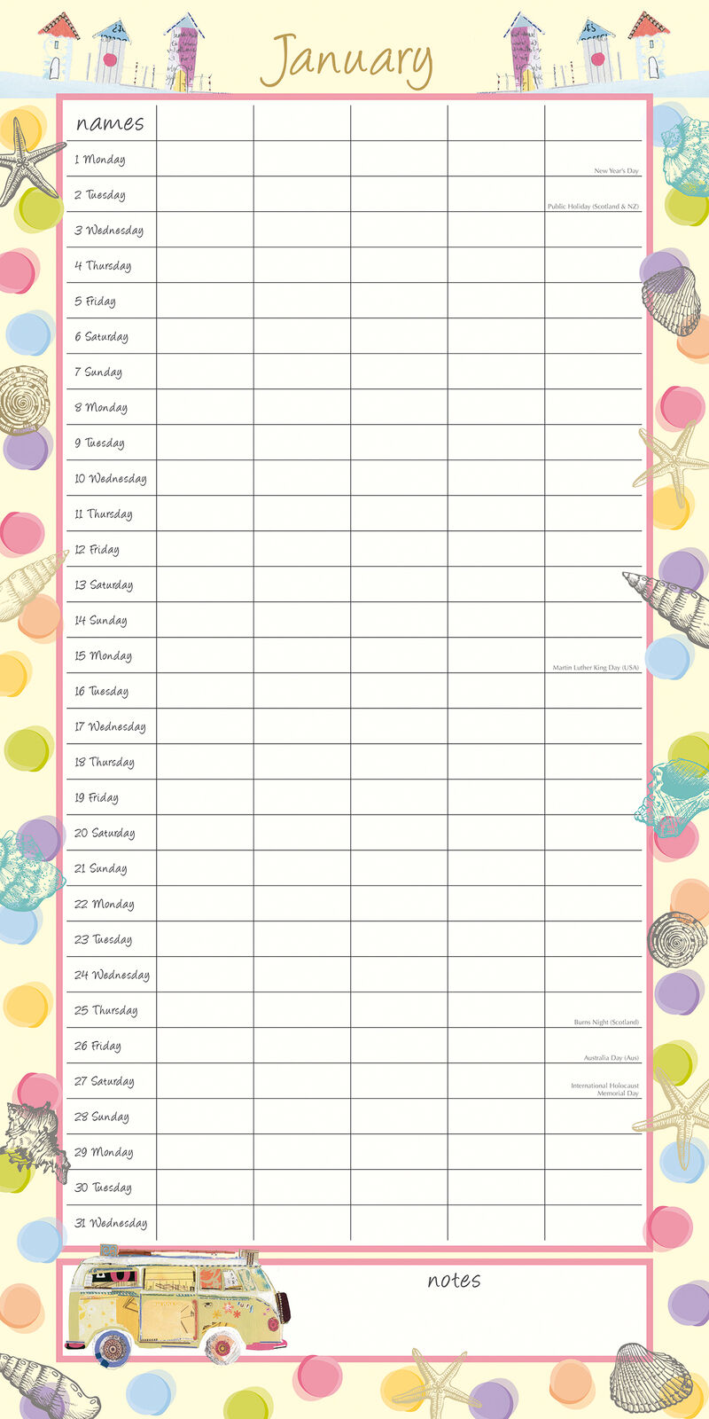 • Public Holidays and major religious dates are marked for Australia, New Zealand, UK, USA, Canada, Japan, and South Africa