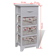 This wooden cabinet with one drawer and three baskets, made of high-quality wood, has a simple, yet stylish design. It will not only hold your things but also add a romantic touch to your decor. With one drawer and three baskets, this durable wooden cabinet has ample room for storing your valuables. Its wooden frame has a sturdy top panel on which you can put decorative items. Our wooden cabinet will be an eye-catcher in any room. Warning: To prevent it being overturned, this product must be used with the provided wall attachment device.