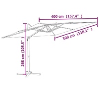 This elegant cantilever garden parasol is a perfect choice for creating some shade and protecting you from the sun's harmful UV rays. Durable material: Polyester is a synthetic material known for its UV resistance and its tensile strength. Polyester with a PA coating is water-resistant, which makes it the perfect choice for humid or rainy conditions, and is also easy to clean.Sturdy structure: The strong powder-coated aluminium pole, along with 15 durable ribs, makes this sun parasol very stable and durable. The outdoor umbrella also features a sturdy cross base to add stability.Tilting and 360-degree rotating design: Adjust the position of your canopy with the tilt mechanism to keep the outdoor area cool and comfortable throughout the day. You can also rotate the umbrella 360 degrees horizontally by simply stepping on the pedal and twisting the pole.Crank system: The crank mechanism allows the garden umbrella to open and close effortlessly. Note:This product is not 100% waterproof, and we recommend treating it with a waterproof spray for a better waterproof function.Each product comes with an assembly manual in the box for easy assembly.