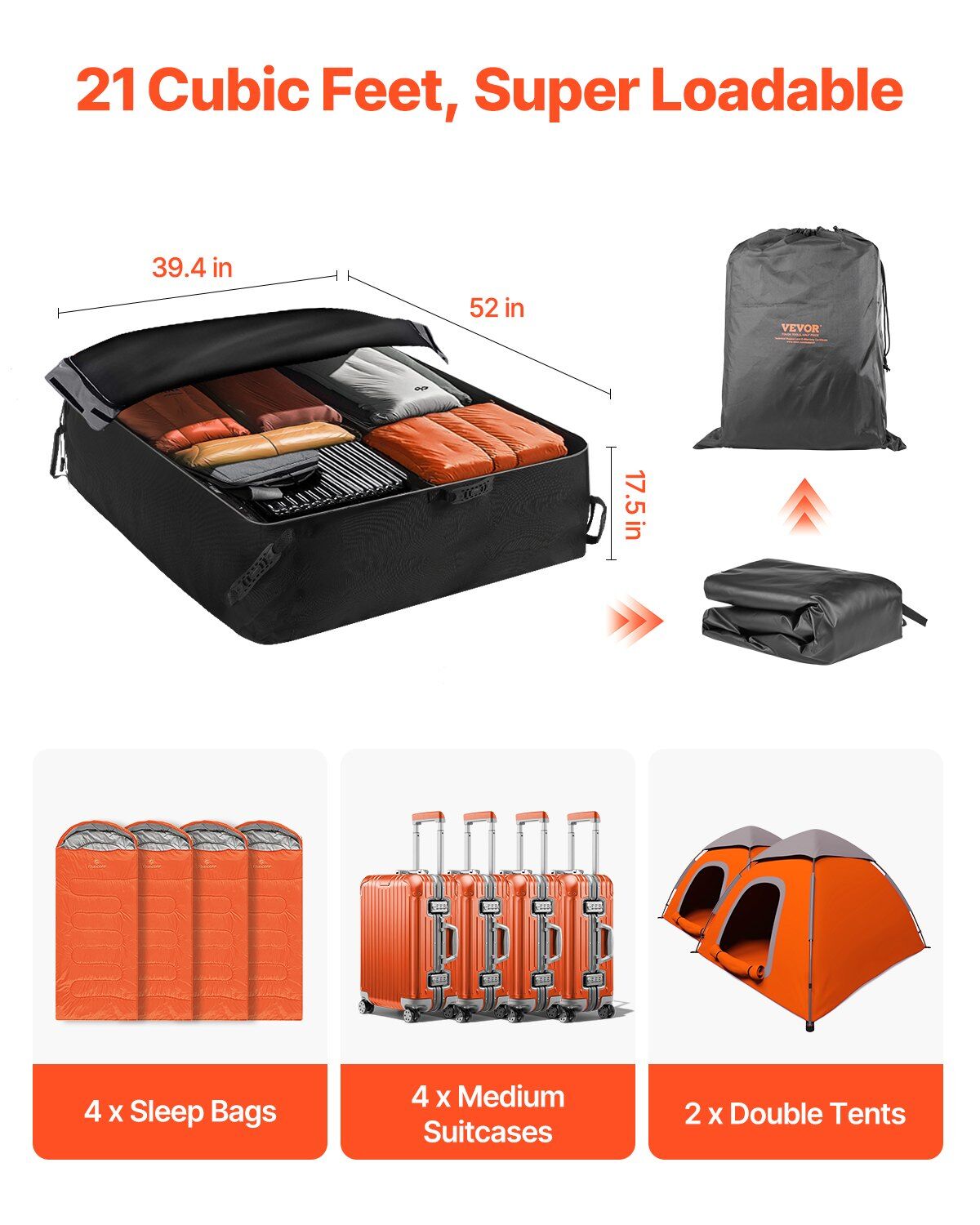 With a generous 52" x 39.4" x 17.5" size, offering 21 cubic feet of space, this roof cargo carrier is perfect for storing sleeping bags, luggage, tents, and more - ideal for road trips, camping, or vacations, ensuring a more comfortable and enjoyable journey.