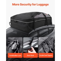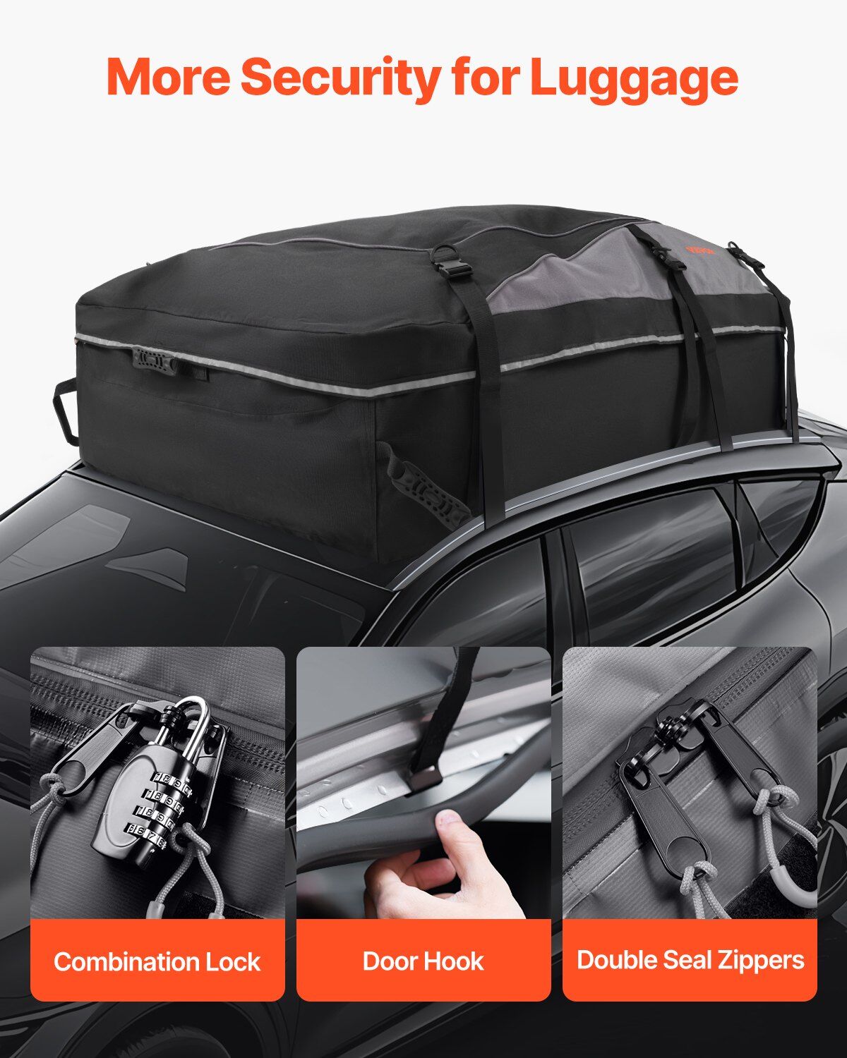 Whether your car has roof racks or not, this luggage carrier bag for car rooftop is designed for universal compatibility with cars, trucks, and SUVs. It comes with a non-slip mat, a combination lock for security, 6 door hooks, and 2 buckle straps for a snug fit.