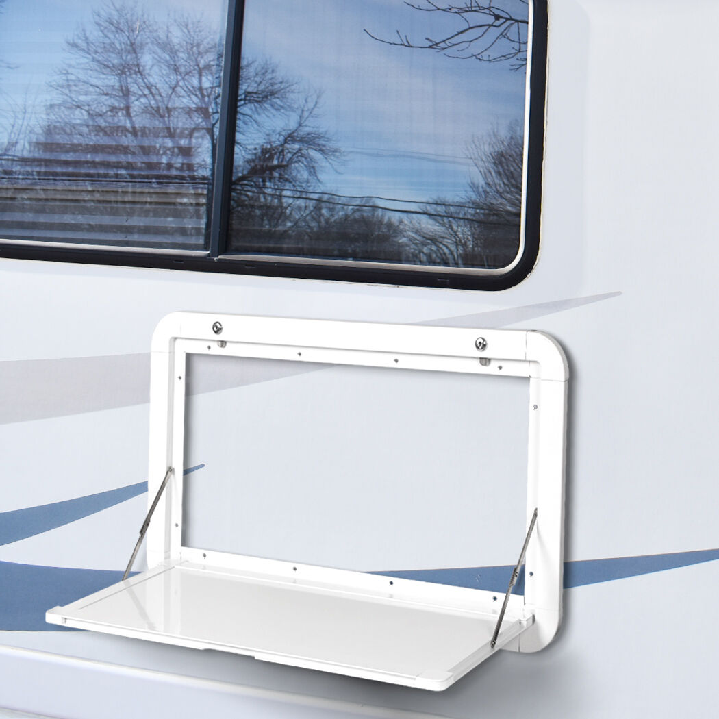 Unlock and open your caravan folding table. Make a quick sandwich by the side of the road while boiling water for a cup of tea. No need to drag a table and set it up.Line up your caravan wall table. Mark the holes. Drill the holes into your caravan. Screw the table on. Done. 10 minutes and you will have your new caravan fold out table ready for your next adventure.Your caravan picnic table is built to withstand the tough outdoors environment. Install your caravan picnic table. Keep on using it until you upgrade to a newer and bigger campervan.Pull down the external table of your food van. Put some condiments and menus out for your customers to take. When you are done for the night just wipe it down fold it up lock it and then be on your way home.After this is mounted to your RV you will be the envy of the entire campervan community. Space is always a limited commodity. Why not build a table on the outside rather than storing one inside.
