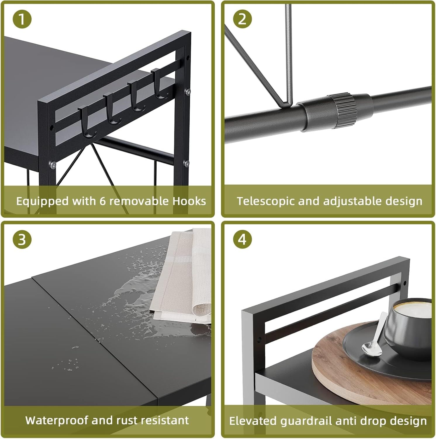 CARLA HOME 2-Tier Microwave Oven Rack with Adjustable Metal Kitchen Shelf Stand for Countertop Storage and 6 Hooks for Utensils (Black)