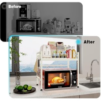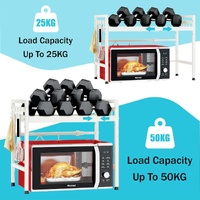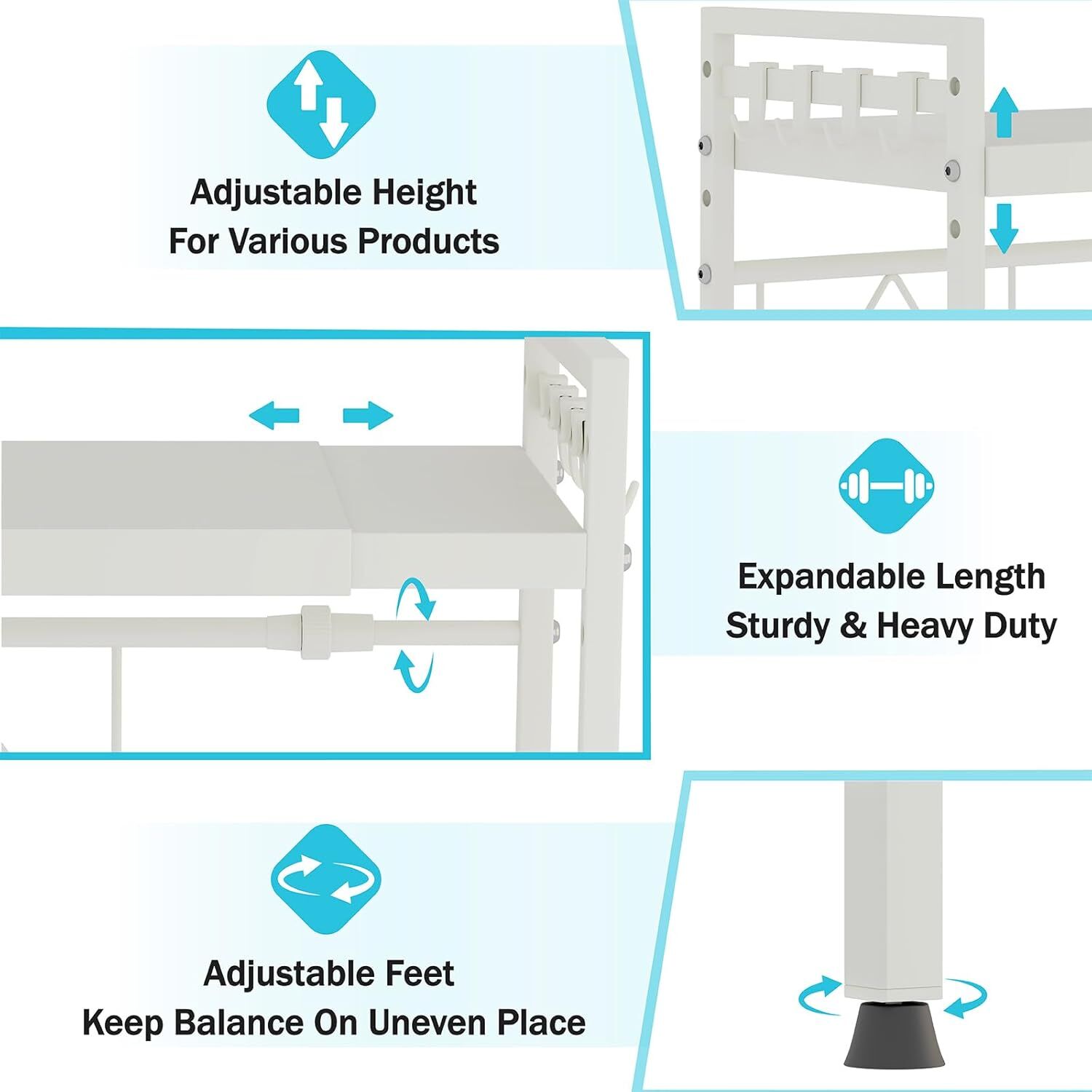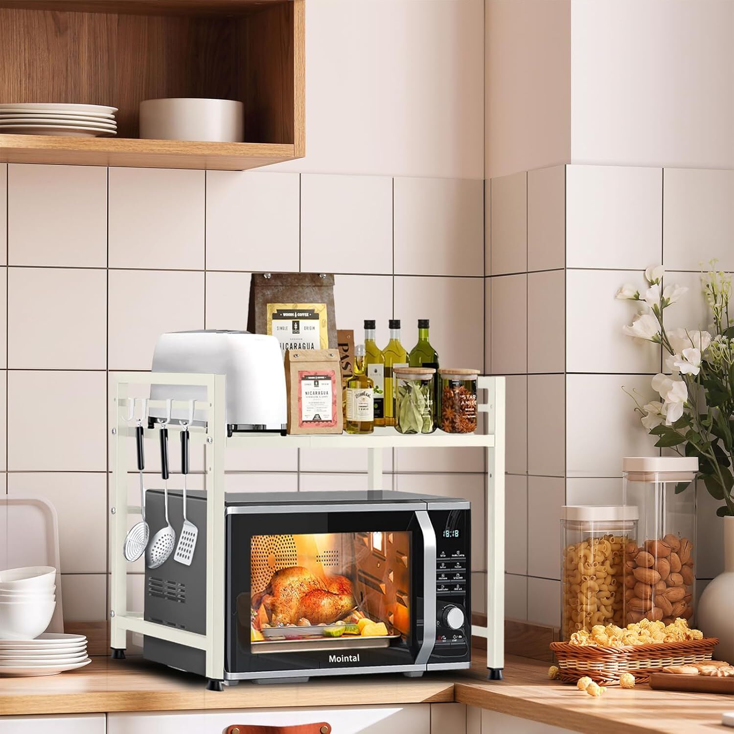 CARLA HOME 2-Tier Microwave Oven Rack with Adjustable Metal Kitchen Shelf Stand for Countertop Storage and 6 Hooks for Utensils (White)