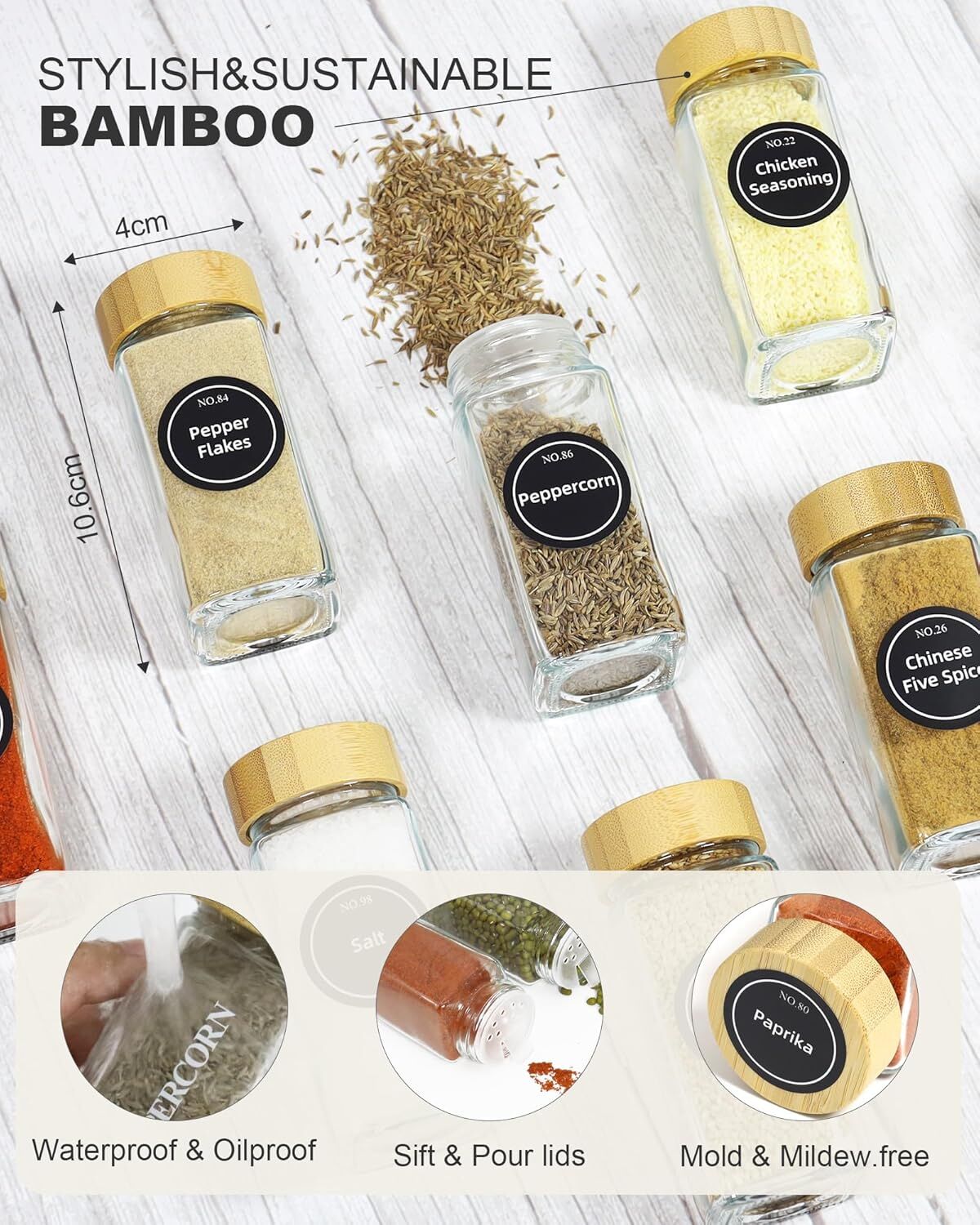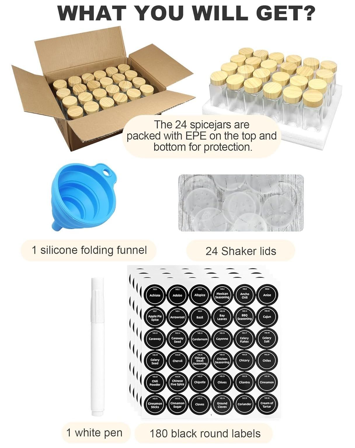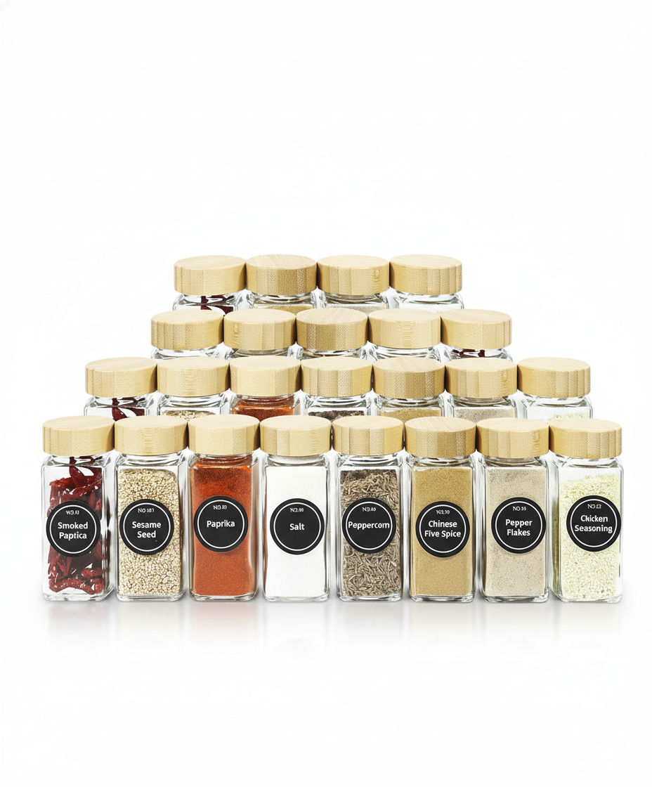 CARLA HOME 24 Glass Spice Jars with Bamboo Lids, Shaker Tops, 180 Spice Labels, White Pen & Funnel for Kitchen Organization, Spice Rack, Seasoning & Herb Storage