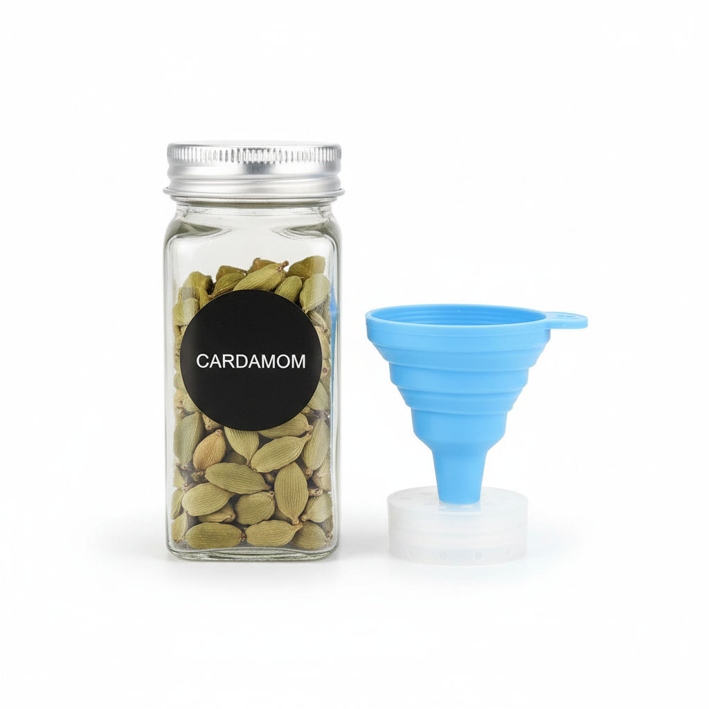 CARLA HOME 24 Glass Spice Jars with Lids, Shaker Tops, 180 Spice Labels, White Pen & Funnel for Kitchen Organization, Spice Rack, Seasoning & Herb Storage