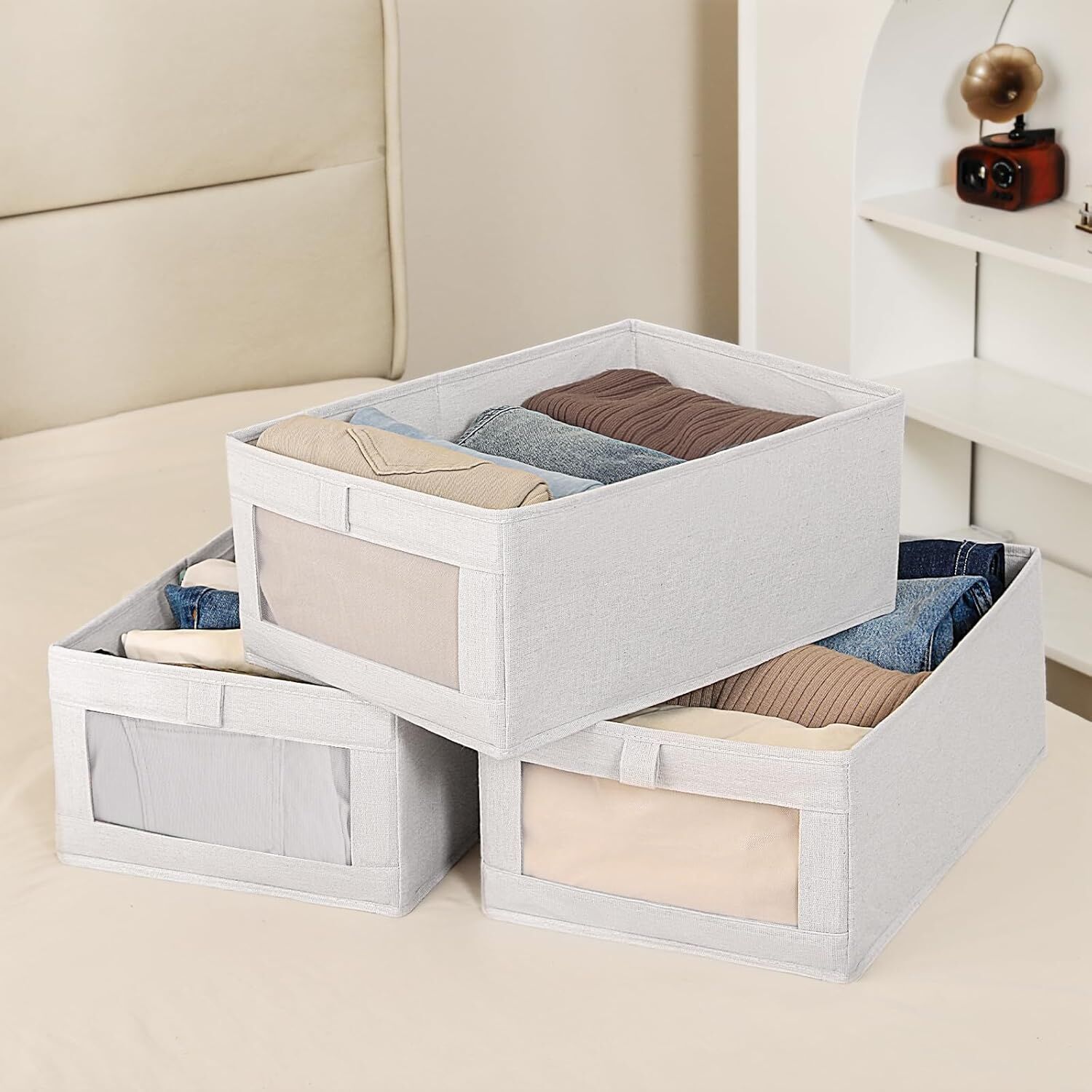 • CLEAR WINDOW DESIGN: The front transparent window allows you to identify contents instantly without opening the bin. Save time and keep your wardrobe organized with a convenient visual display that makes access quick and effortless.