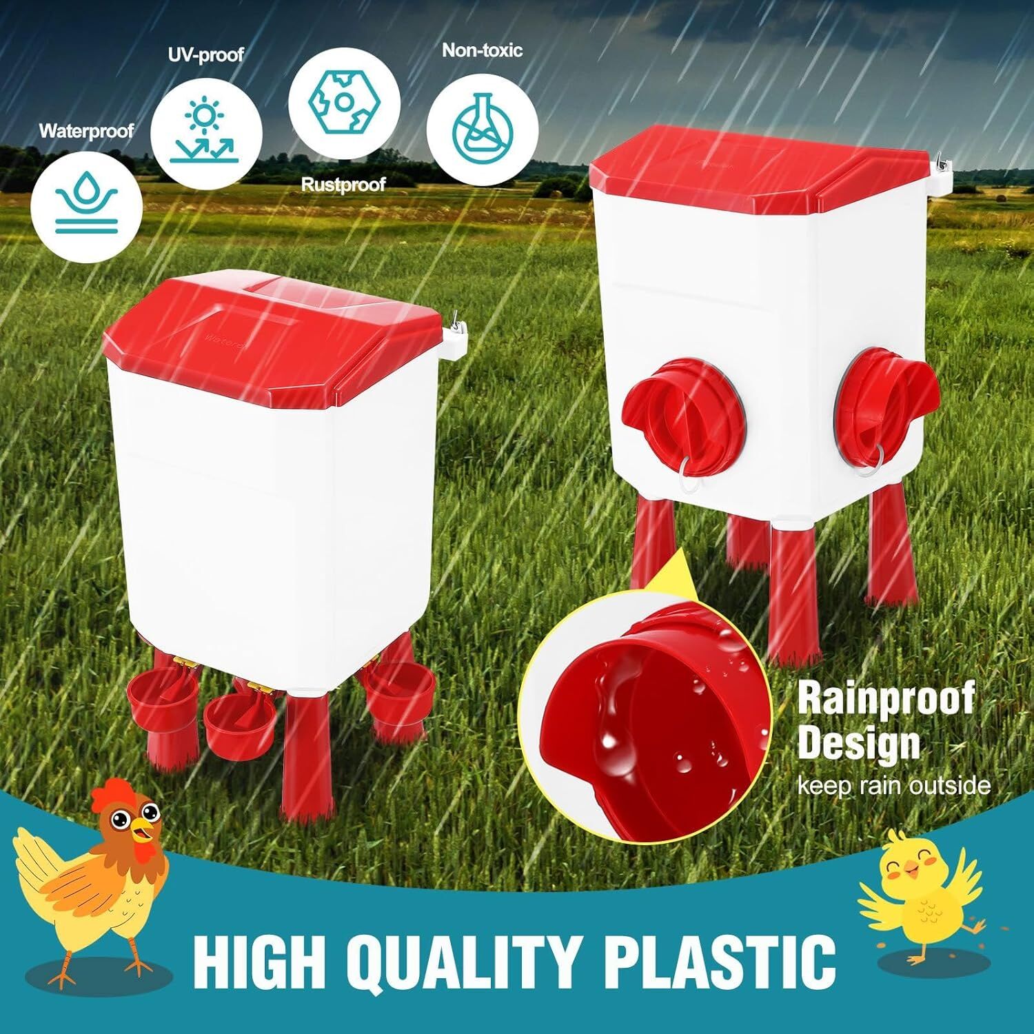 • AUTOMATIC GRAVITY SYSTEM: The feeder and waterer use gravity-fed flow to ensure a steady supply of dry food and clean water without manual refills. Your poultry can self-serve day and night, reducing labor and avoiding waste.