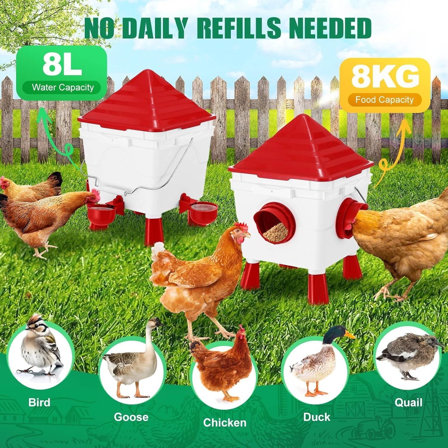 • GENEROUS 8KG + 8L CAPACITY: With an 8KG food bucket and 8L water reservoir, this poultry feeder and waterer set minimizes refill frequency—perfect for busy poultry keepers or weekend trips away. Supports chickens, ducks, quail, geese, and more.