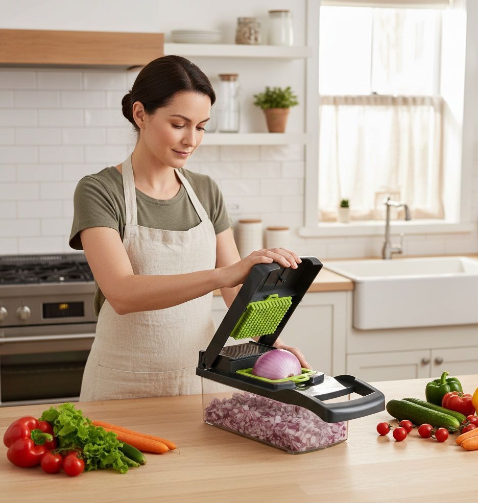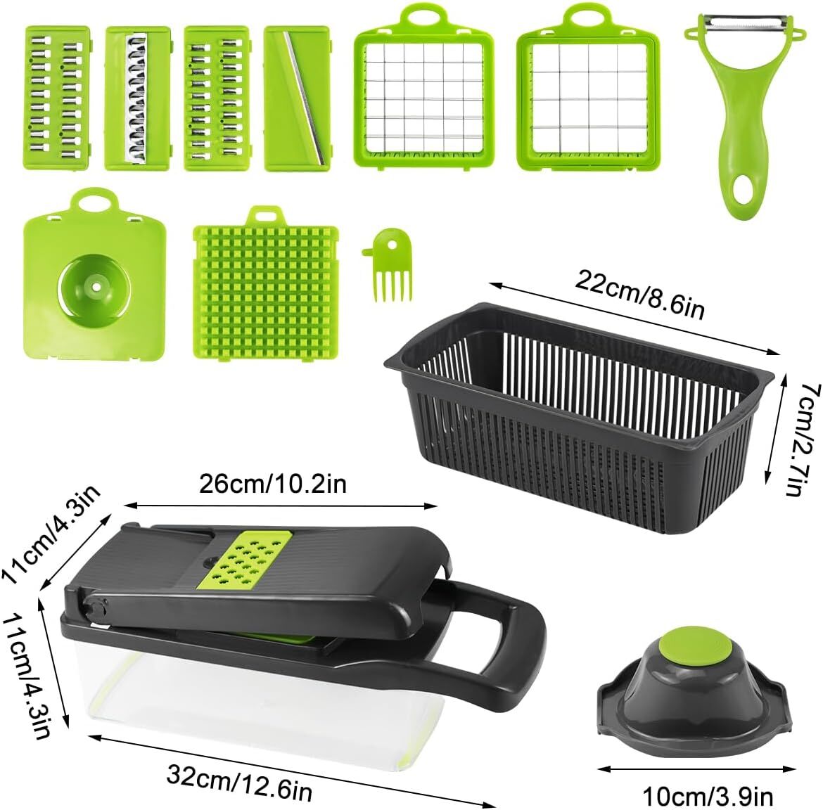 • ULTRA-SHARP STAINLESS STEEL BLADES: Equipped with 8 interchangeable stainless-steel blades for precise slicing, shredding, chopping, and julienning. Ideal for cutting onions, potatoes, cucumbers, carrots, fruit, cheese, and more—delivering clean, consistent results with less effort.