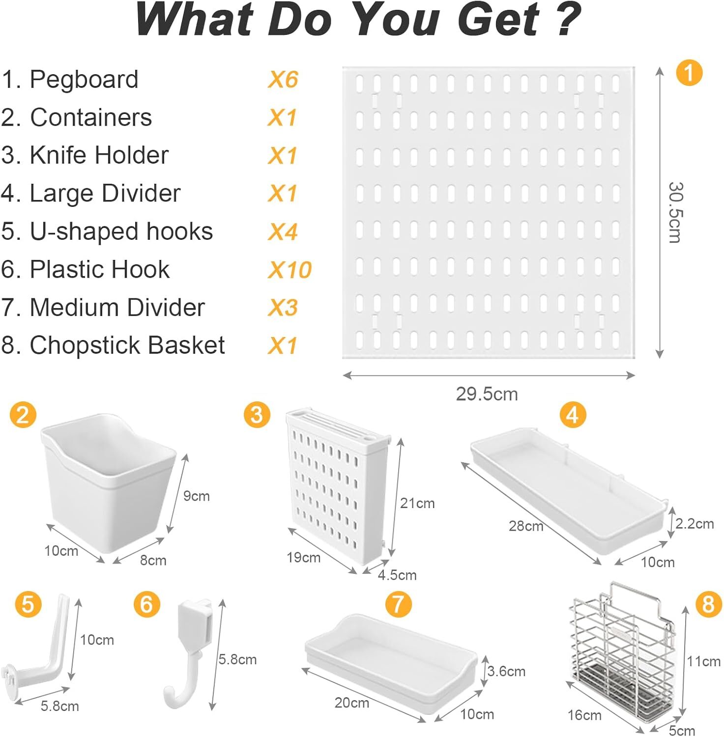 • CUSTOMIZABLE MODULAR SYSTEM: Transform any wall into a personalized organization station with this 27-piece pegboard wall organizer kit. With 6 modular pegboards and 21 versatile accessories, you can configure your layout to fit kitchens, offices, gaming rooms, craft spaces, and more.