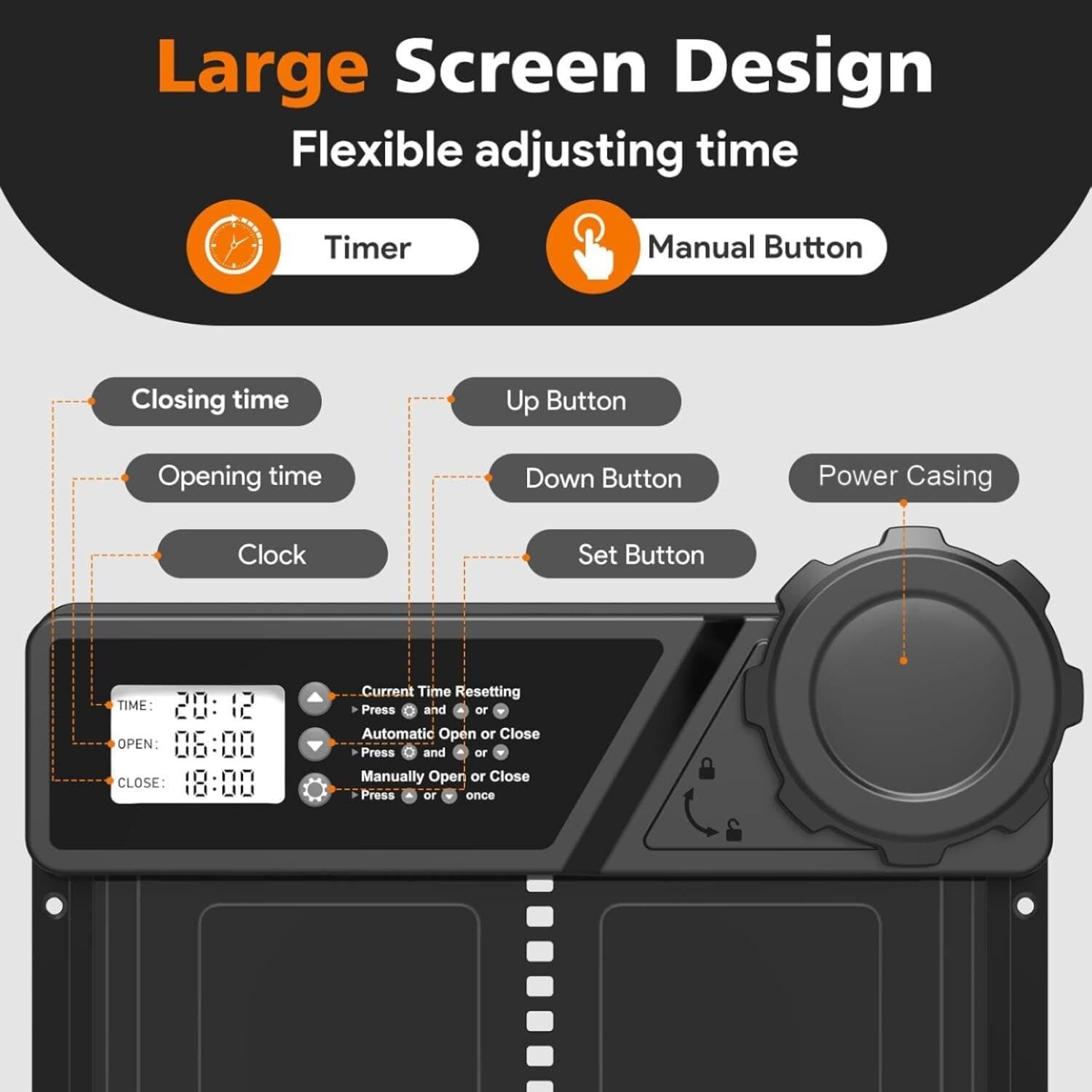 • REMOTE & MANUAL CONTROL OPTIONS – Adjust the door from inside your home using the handheld remote (up to 15m range). Onboard buttons and a clear LED display make it simple to change modes or settings directly at the coop.