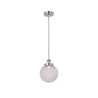 The Casablance Pendant Light offers a classic spherical design that scatters light via a dimpled diamond glass cover. The ceiling mount and main fixture feature a striking chrome finish from which the sphere hangs.