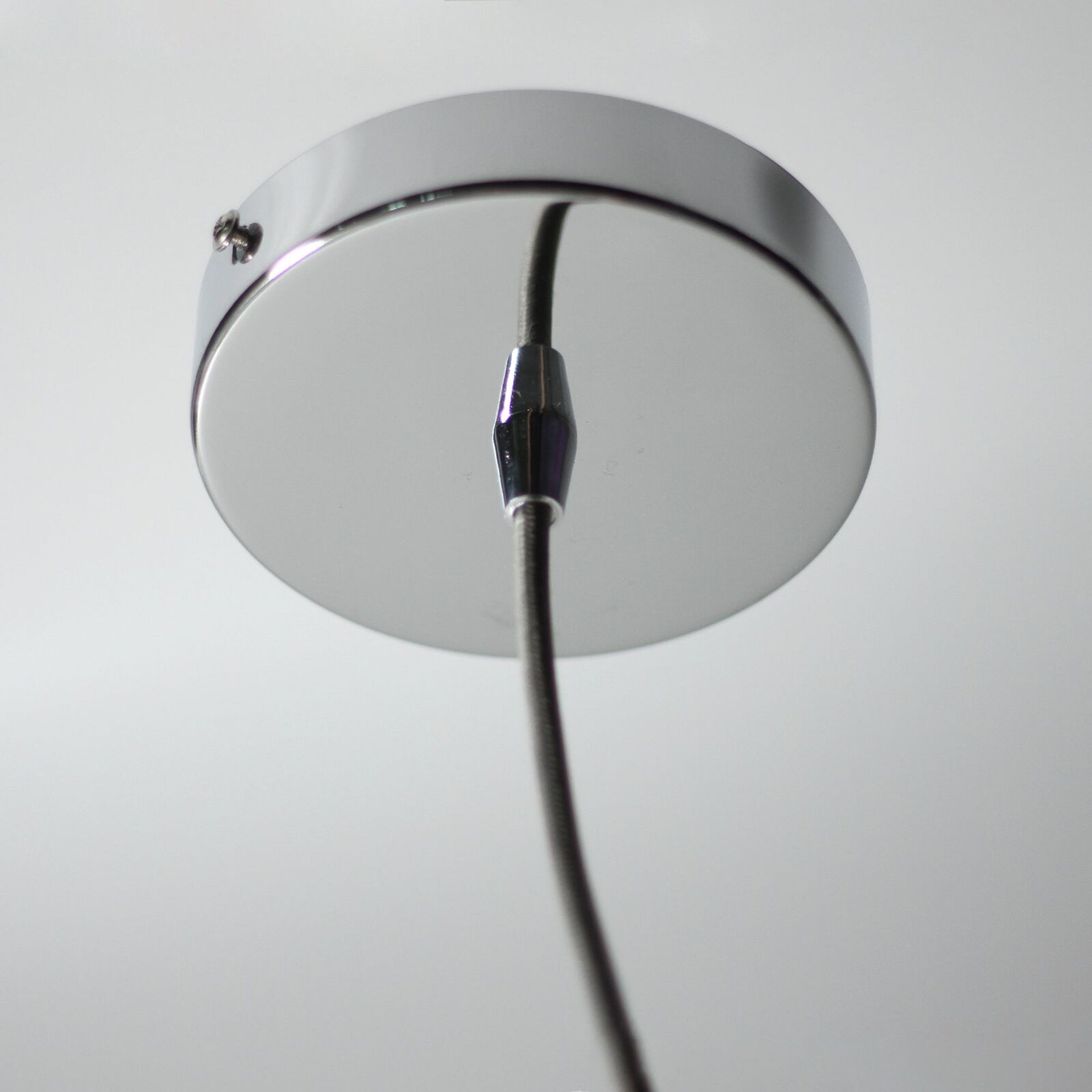 At the top of the light's base, a knurled ring provides a contemporary contrast to the classic polished chrome body. The Casablance Pendant Light comes in a small 200mmx200mm diameter sphere and a larger 300x300mm. The sphere is fastened by four round head screws displayed as a feature.