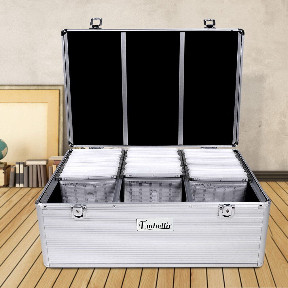 The highly durable Aluminium CD Storage Case will prevent you from scratching or cracking your discs that nearly everyone has made the mistake. It is very frustrating to have your disc damaged and you can't save at that point any longer. Our aluminium CD case will ensure you that your music, games, movies, or anything you save in the disc will be safe for years to come. The Heavy Duty CD Case is made of aluminium with black velvet lining giving it a sturdy structure, light in weight and a chic look all at one time. The case comes with 500 inserts and each can hold 2 disks giving it a maximum capacity of 1000 disks. The inserts has index labels to ensure easy selection and reference. For your privacy and protection, the case comes with 2 locks and 2 keys.