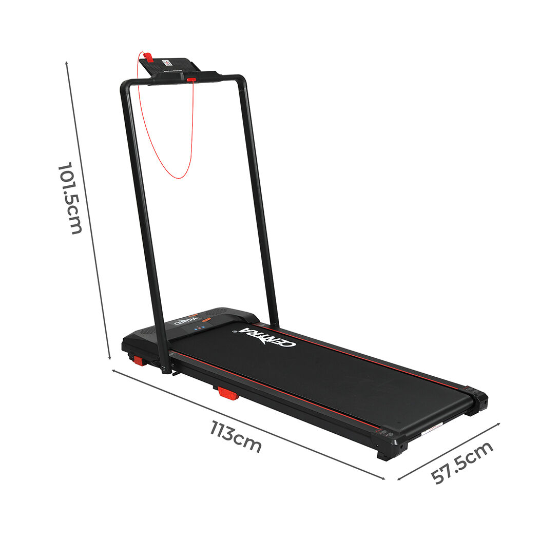 This walking mat treadmill is ideal for family exercise, its speed range is 1-12 km/h, suitable for gentle walking to intense running, to meet different fitness levels. The manual incline feature allows you to simulate uphill climbs, adding additional challenges to your daily routine. Designed with a double-layer flexible running board and silicone shock absorbers, the impact on the knee is reduced, ensuring a safer and more comfortable experience. A LED display tracks your speed, time, distance and calories, while a remote control slot ensures your remote is always safe and within reach. With a Bluetooth connection, you can make your workouts more interactive and engaging by connecting to apps like Kinomap and Zwift. This treadmill is a great addition to any home gym, providing a personalized and effective fitness experience.