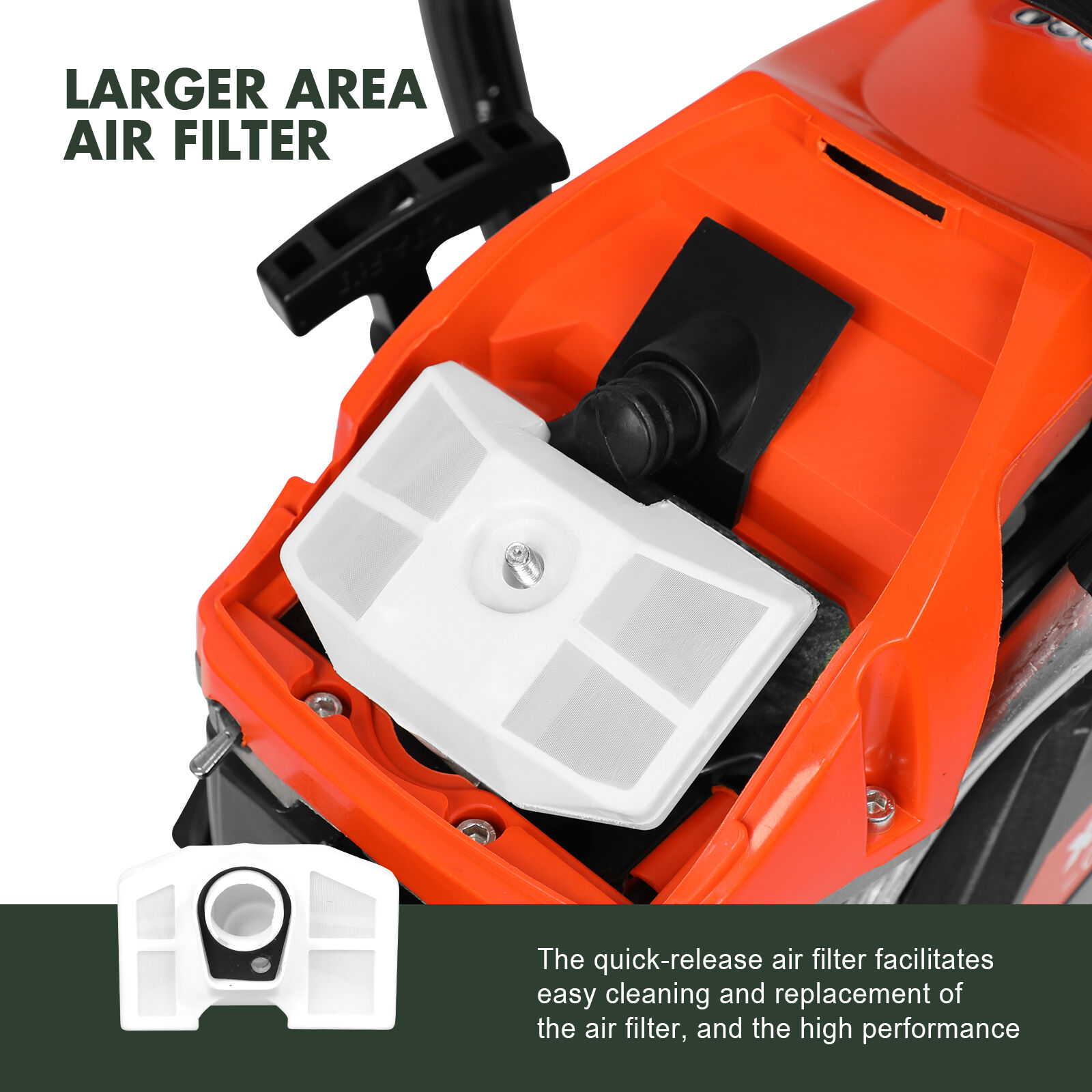 Easy service access to engine, filters and spark plug