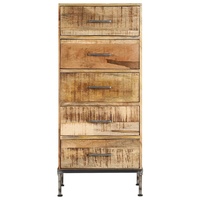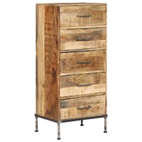This wooden chest of drawers exudes a vintage charm and will be the centre of attraction for your interior. This drawer cabinet is made of solid mango wood, which is a hardwood with dense grains. Rough mango wood not only has the strength to bear the weight, but also stands the wear and tear of time. Therefore this beautifully-designed side cabinet is stable, durable and eye-catching. The craftsmanship and the beautiful wood grains make every piece of furniture unique and slightly different from the next. The iron handles add the side cabinet's industrial style. Besides, this sideboard features 5 drawers, providing ample space for storing your clothing, books, and various other items. Important note: The colours vary from piece to piece, making each piece unique. The delivery is random, ensuring the exclusivity and individuality of your product.