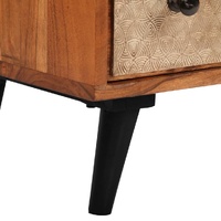 This wooden chest of drawers radiates a vintage charm and will be an eye-catching piece in your home interior. This drawer cabinet is made of solid acacia wood with a subtle honey finish, which adds a beautiful look and warm colour to it. The gorgeous decorative metal details in different colour tones, as well as the antique-style handles, endow the commode with a touch of luxurious charm. High quality craftsmanship and beautiful wood grains make every piece of furniture unique and slightly different from the next. This side cabinet features 4 drawers, providing ample space for storing your clothing, books, and various other items. Important note: The colours and wood grain may vary from piece to piece, making each chest of drawers unique. The delivery is random, ensuring the exclusivity and individuality of your product. Warning: To prevent it being overturned, this product must be used with the provided wall attachment device.