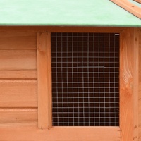 This high-quality hutch provides a cosy and comfortable place for keeping small animals especially chickens to relax. The hen house is built with high-quality wooden frame which lasts for years. The construction of iron wire mesh window ensures your monitoring of the chickens and enables them to get enough fresh air. You can take the fresh eggs without much effort by simply open the upward panel of the side cage. The cage keeps a distance from the ground which protects the pets against cold and humidity. While the green roof keeps rain away, the cubby offers the perfect sleeping area simultaneously. An easy-climb ramp leads from the ground to the cage. This wooden chicken cage is easy to assemble.