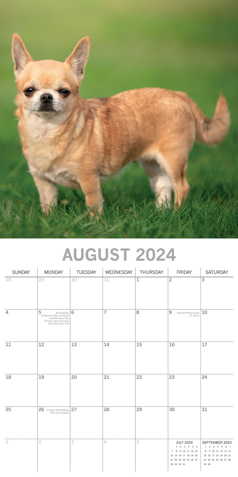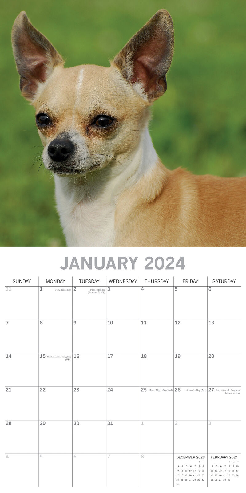 Chihuahuas are small, sprightly, loyal, and lively. They get their name from the desert state of northern Mexico. Legend says that they were sacred to the pre-Columbian people. Considering they average under five pounds, it is no wonder that they have a special attachment to the warm sun of Mexico. Chihuahuas are most comfortable in their owners’ arms, but they look rather cheerful alone and amongst themselves in this square wall calendar. Brand New Calendar with Beautifully design, Sealed in Original Packaging, each calendar includes a large grid running from Sunday to Saturday. Publisher: The Gifted Stationery Co. Dimensions: 30cm (w) x 30cm (h) closed; 30cm (w) x 60cm (h) opened Time Span: 16 months (January to December 2024 monthly, September to December 2023 on-a-page) 2024 Square Wall Calendar featuring beautiful colour photographed images for every month of the year. Like most Wall calendars, this one comes with: