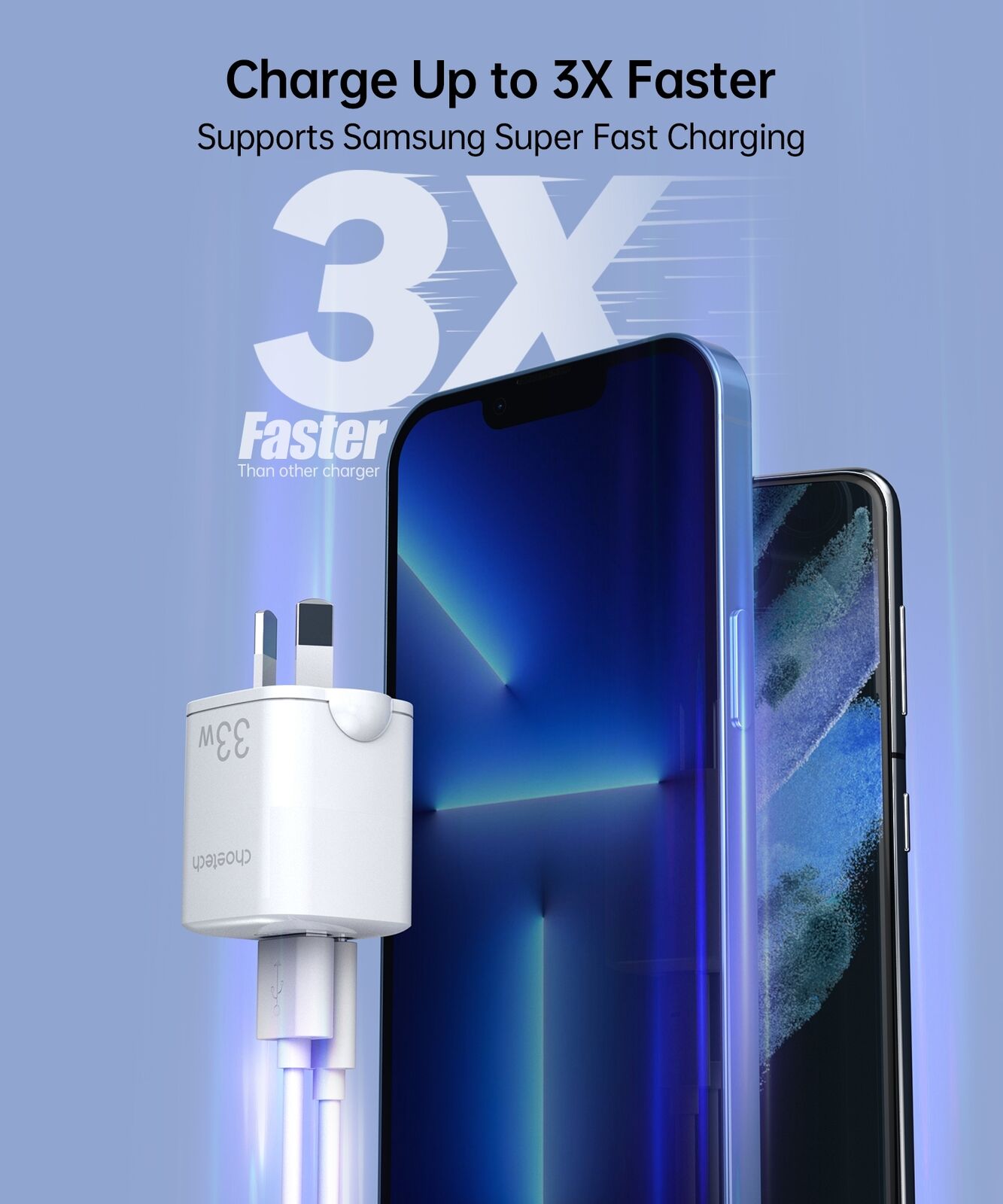 Choetech's 33W Dual Port Wall Charger is 59% smaller in size than Apple's charger without compromising it's performance and fast charging capabilities.Fast charge two devices simultaneously, including laptops and tablets.