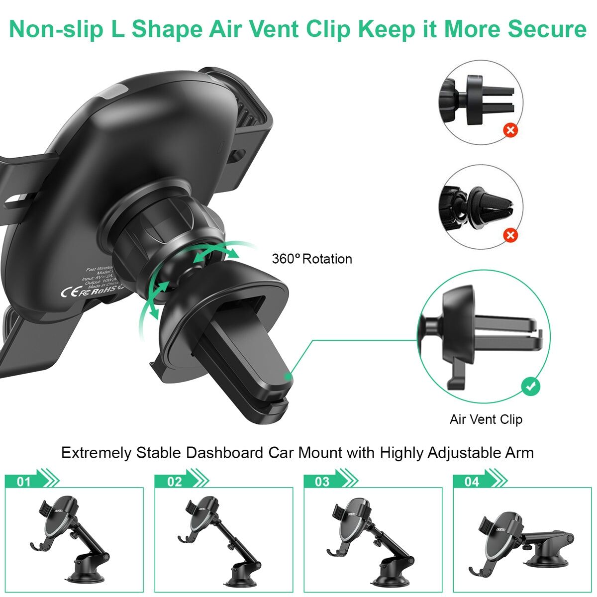 The fast wireless car charger, with soft silicone on the phone clamp arm and air vent mount, will hold your phone securely and prevent it from falling off. Besides, the hook on the end of the air vent mount makes the car charger fixed more securely on your car. And these smart design won't scratch your phone or damage your car.