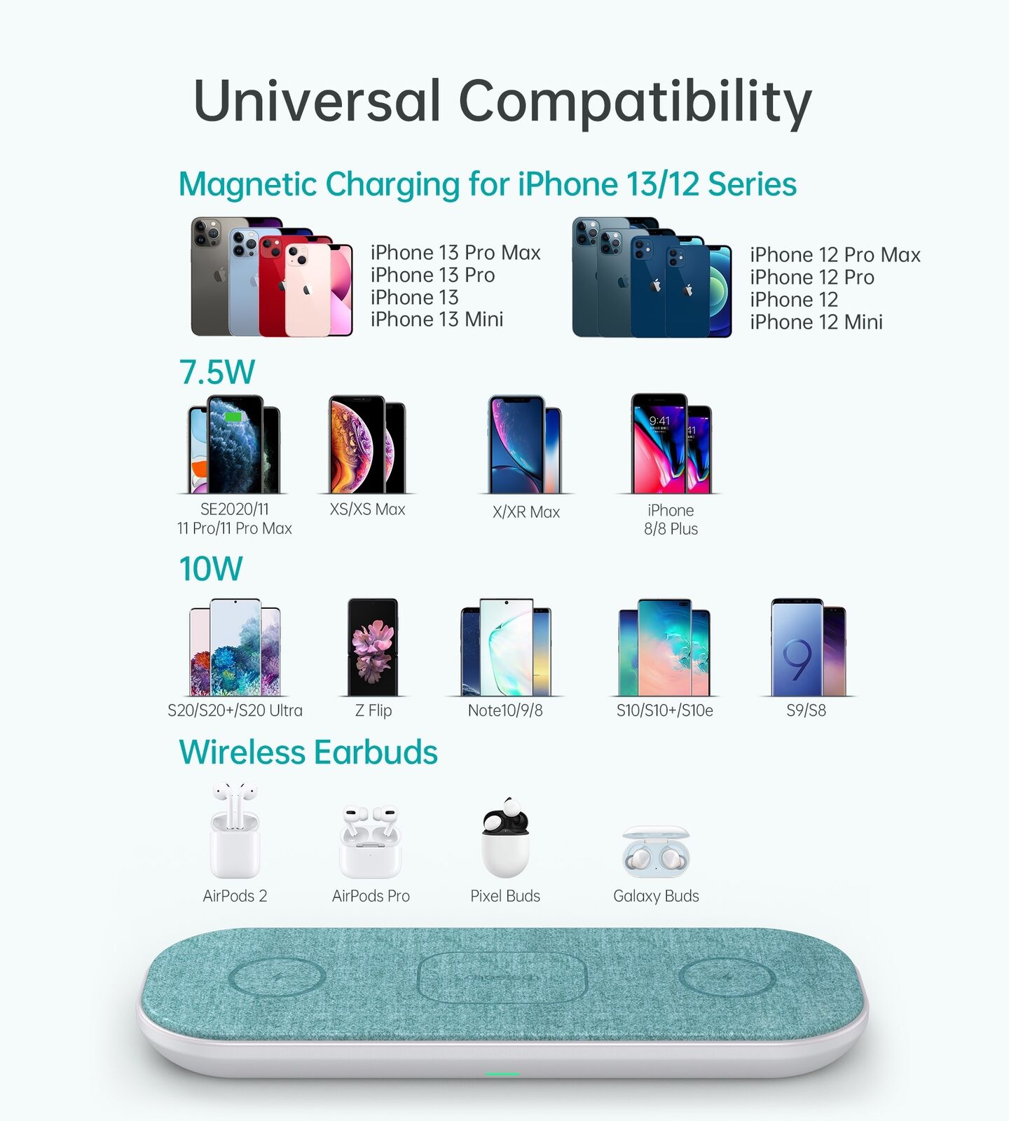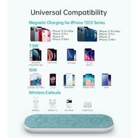 3 in 1 magnetic wireless charging pad for multiple devices, CHOETECH triple wireless charger design with anti-slip fabric surface in green to avoid intermittent charge and also delivers an elegant and classy look, great suitable for friends or family gathering.