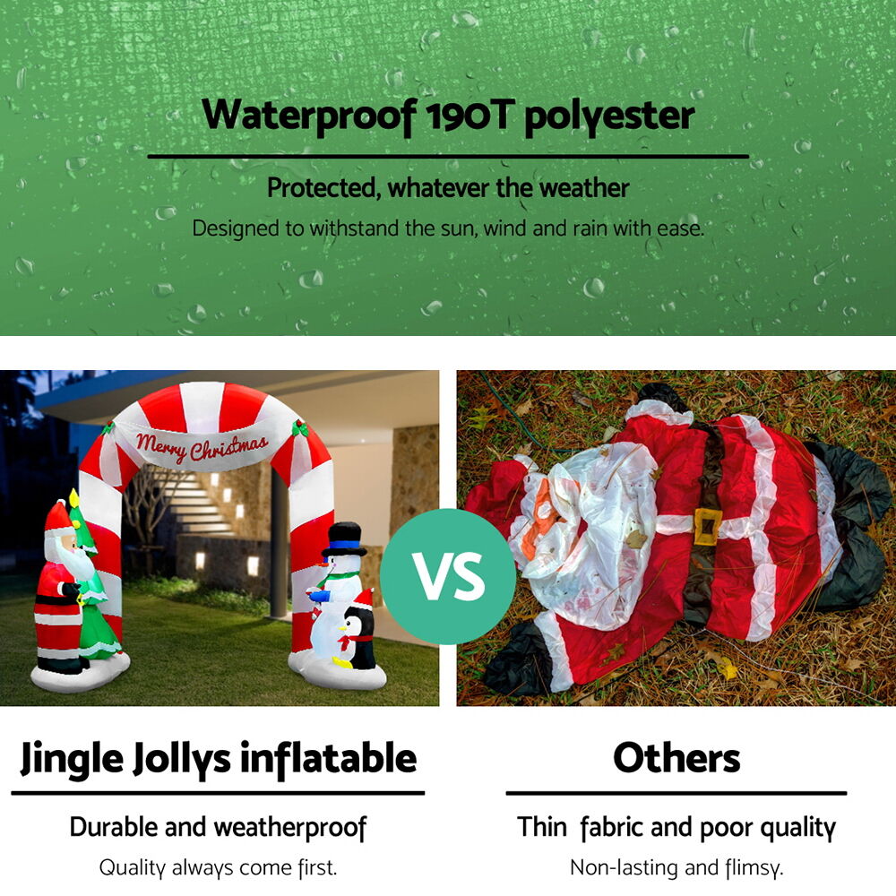 Add festive charm to your home with our Jingle Jolly Christmas Inflatable. Crafted with water-repellent and UV-resistant materials, it is perfect for indoor and outdoor use. The built-in air blower ensures effortless inflation. For quick storage, simply unzip and deflate. Pegs and ropes are also included for secure ground anchoring, bringing you peace of mind. Create a magical holiday display effortlessly with this delightful inflatable centerpiece!
