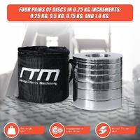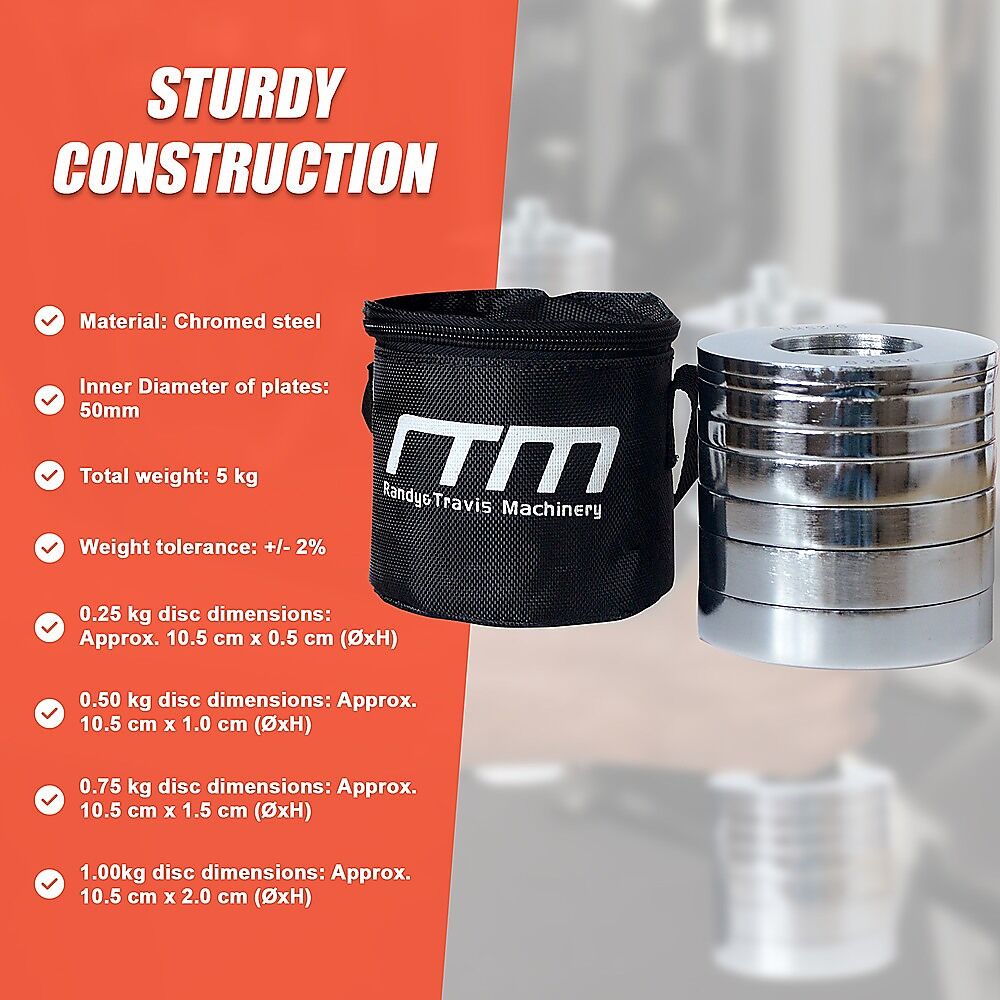 NOW $114.63These metric fractional Olympic weight plates by Randy Travis Machinery range from 0.25 kg to 1.0 kg. Gradually build up your resistance, bit by bit, so you have less risk of sustaining an overuse injury from increasing the weight you lift by too large an increment. Whether you're a bodybuilder or just lift weights as part of a fitness or cross-training program for another sport, these fractional plates will serve you well with their fine-tuned sequence of training weights.