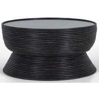 This gorgeous coffee table adds a fresh beauty to a living room. With its distinct design, round shape, black distressed colour, and glass top, the traditional style coffee table will beautify your living area. The table is designed in an exotic pattern using sustainably harvested rattan material and a metal frame. It is crafted using a unique weaving and finishing technique. Each piece is handmade from natural cane using age old traditional construction methods and so no two products are the same. Each will come with their own unique variations and look. The material ensures the table's strength, long durability, and beautiful appearance. The stunning indoor furniture will become the perfect companion for any kind of lounge or sofa, while also becoming a stopover for tea, coffee, magazines, and devices. The fully assembled coffee table comes with a one-year warranty.