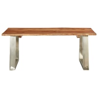 This premium coffee table features a cool, industrial style and will make a great addition to your home or office. Made of solid acacia wood, this tabletop is exceedingly sturdy. The stainless steel legs add to the industrial style and make the table considerably stable. The wood's live edge that follows the natural shape of the tree increases the beauty of the table. The couch table needs to be assembled. Please note that wood is a natural product and may show imperfections.
