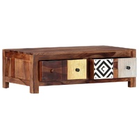 Introduce an air of mid-century elegance to your home decor with our antique-style solid wooden coffee table! This coffee table is made of solid sheesham wood. Sheesham, also known as rosewood or palisander, is a tropical hardwood famous for its rich grain. This table has stable and secure top to place drinks, fruit baskets, decorative items, etc. The solid sheesham wood has been given a beautiful finish by polishing, painting and lacquering, making it exude a refined look. Two big drawers, whose front doors are decorated with different mixed pattern, one with screen and silver and the other with sheesham and gold, provide sufficient space to accommodate large household items. Additionally, the coffee table can also be used as a couch table, a living room table, a side table etc. Important note: The exquisite craftsmanship and the beautiful solid sheesham wood grains make every piece of furniture unique and slightly different from the next. The delivery is random, ensuring the exclusivity and individuality of your product.