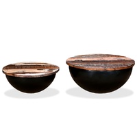 This set consists of 2 elegant wooden coffee tables with a unique, industrial design and will make a distinctive addition to your home. The unique, bowl-shaped steel base gives each table its industrial flair. Each table has a solid wooden tabletop, ideal for placing food and drinks, decorative items, books, etc., while the concealed storage compartment provides extra space to keep clutter at bay. The tabletop is made of solid reclaimed wood, which means that every table is unique and slightly different from the other, and has the characteristics of different woods, like teak, acacia, mango wood, etc. Reclaimed wood is solid, stable, durable and beautiful. The coffee table has undergone an elaborate process of polishing, painting and lacquering. Relax and enjoy entertaining your family and friends around this unique coffee table set! Delivery includes 2 coffee tables. Note: The coffee tables are already assembled; no assembly is required. Tabletop colours may vary from piece to piece, making each of our coffee tables unique. The delivery is random, ensuring the exclusivity and individuality of your product.