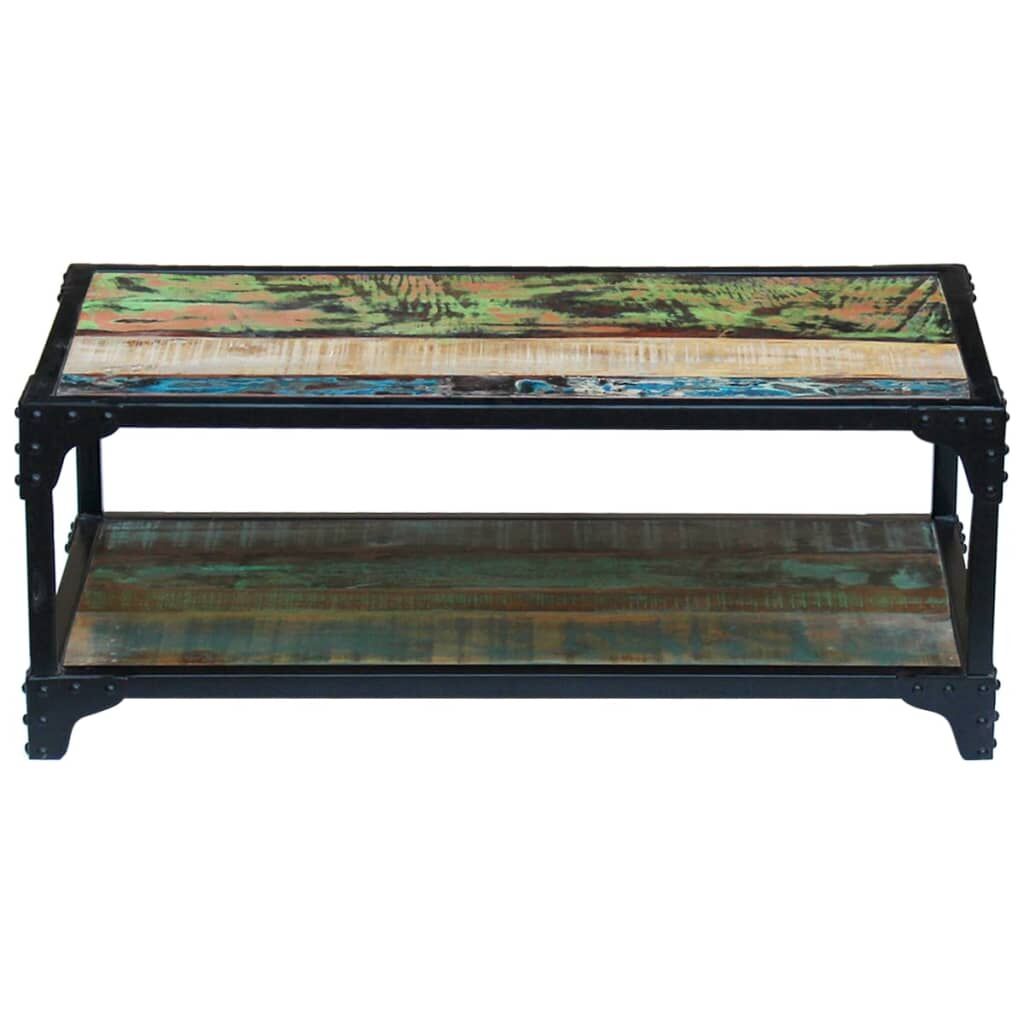 This vintage-style wooden coffee table, made of solid reclaimed wood, will make a timeless addition to your home. Thanks to the strong steel frame, the coffee table is very steady and durable. The tabletop provides a stable and secure surface on which you can place your drinks, a fruit basket or vase or other decorative items. The shelf on the bottom provides ample space for storing multimedia appliances, books, magazines, and other items you want to keep within reach. The coffee table can also be used as a couch table, living room table, side table, etc. The coffee table is made of recycled wood, which means every piece of furniture is unique and slightly different from the next. Furniture made of reclaimed wood has the characteristics of different woods, like teakwood, acacia, mango wood, saal wood, etc. Reclaimed wood is solid, stable, durable, and beautiful. Signs of wear and visible grain structure give each piece its own history and unique look. The table is fully handmade, and the craftsmanship adds to its spectacular retro style. Every step of the process is carried out with the greatest care, be it recombining, polishing, painting or waxing. Important note: Colours vary from piece to piece, making each of our coffee tables unique. The delivery is random, ensuring the exclusivity and individuality of your product.