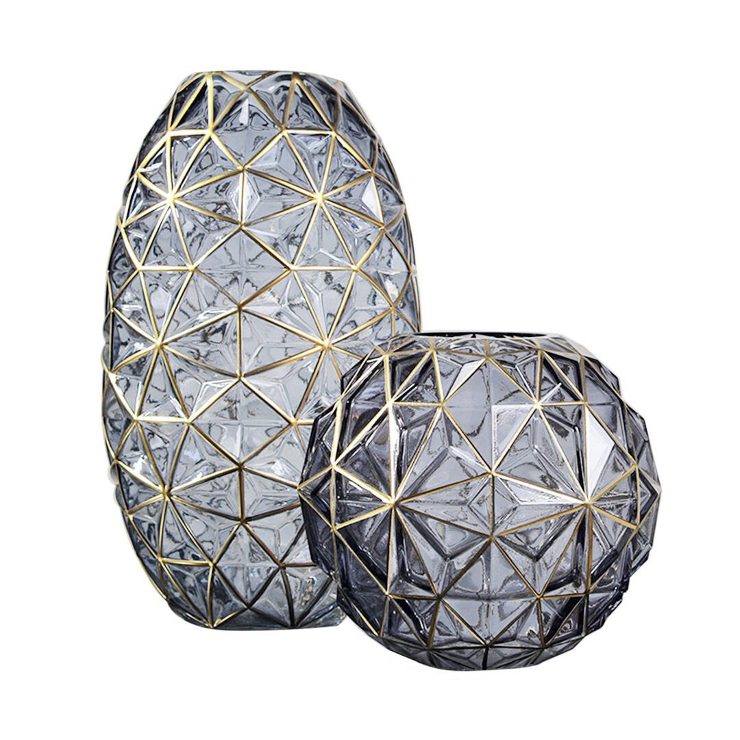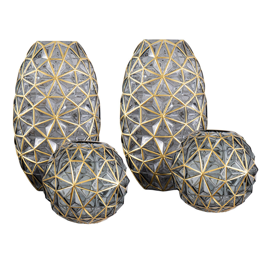 Colored Diamond Cut Glass Flower Vase Round Jar Home Decor with Gold Accent