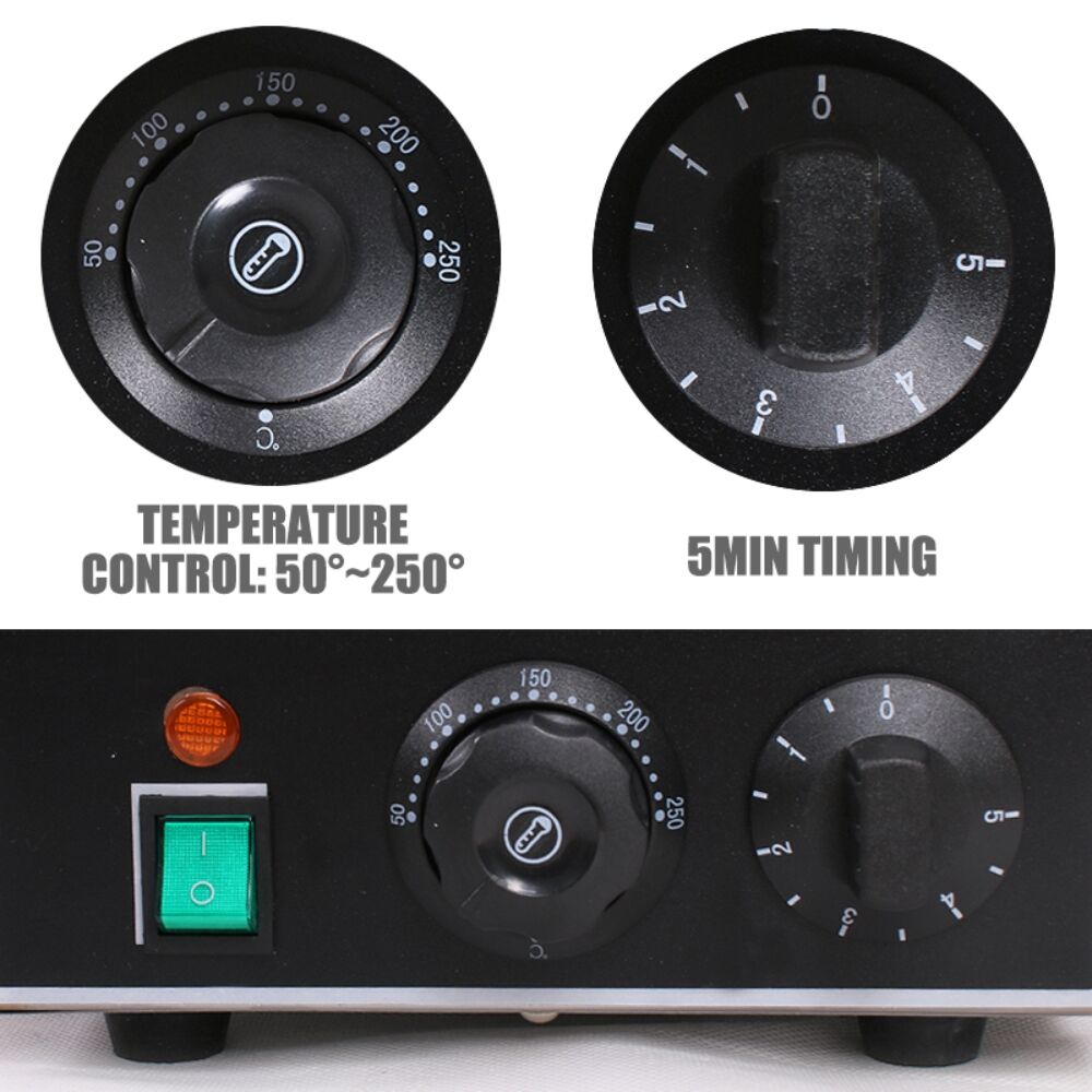 -The machine is designed for baking waffles with independent heat control and cast iron molds.