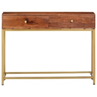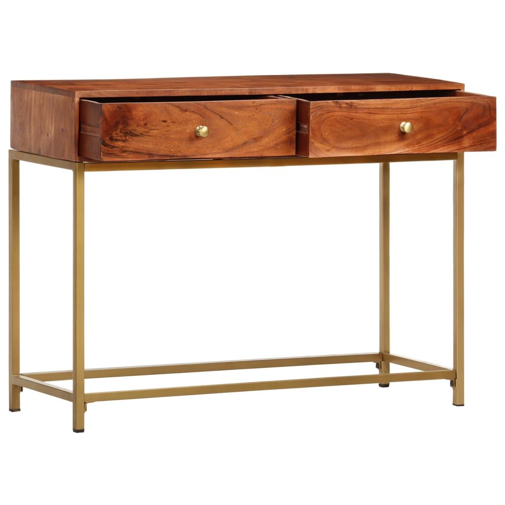 This classic wooden console table will make a distinctive addition to any room. It can be used as a sideboard, high cabinet, side table, high board, drawer cabinet, etc. The table is made of solid acacia wood that has been given a beautiful finish by polishing, painting and lacquering to provide a refined look. The table is entirely handmade, and the beautiful wood grains make every piece of furniture unique and slightly different from the next. Its iron legs with brass powder coating add to its sturdiness. It has a sturdy top, on which you can place a fruit basket, vase or other decorative items. Two smooth slide-out drawers can be used to store items like magazines, notepads, book and other knick-knacks. The console table is easy to assemble. Important note: The colours vary from piece to piece, making each of tables unique. The delivery is random, ensuring the exclusivity and individuality of your product.