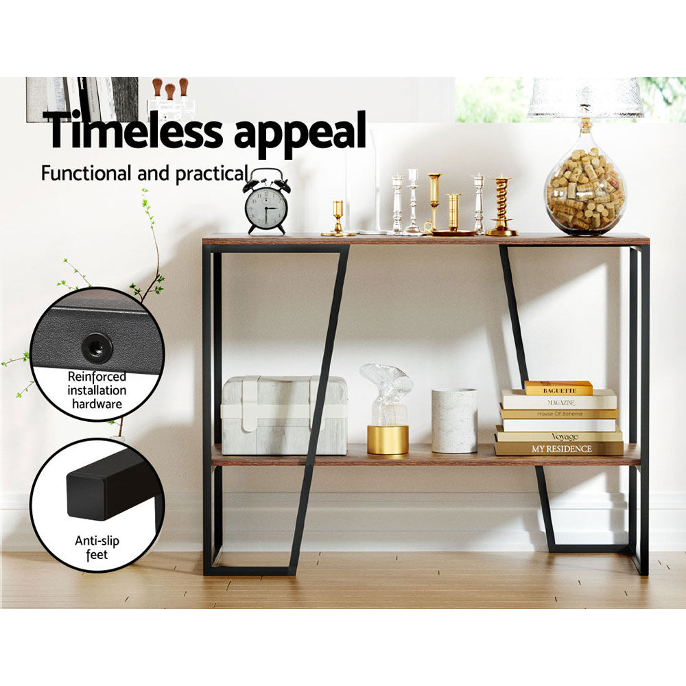 $91.17Looking for extra storage space in your living room or hallway? The industrial-style Cora Console Table is the ideal entry piece to welcome visitors, hold décor, and complete the look of your living room. Crafted from 15mm thick, sturdy particle board and anti-rust powder-coated black steel, the table is durable and designed to stand the test of time. The extra side bracket support keeps the table balanced and strong, giving the shelves a 30kg total weight capacity. 2-tier shelves give you plenty of room to store collectables, memorabilia, family portraits, or anything you see fit. Anti-slip feet keep the shelves in place so you never have to worry about slipping or scratching your floors, and the whole piece is simple to assemble and maintain so you can get to organizing right away. Get creative with your living space and enjoy the simple things with your new Cora Console Table.