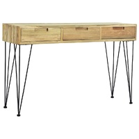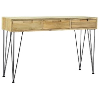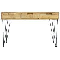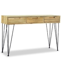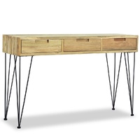 This colonial-style console table, made of recycled solid teak, will add a touch of rustic charm to your interior. It can also be used as a side table, desk or sideboard. The table has a sturdy hardwood top, on which you can place decorative items like fruit baskets or vases. The 3 drawers provide ample space for keeping all kinds of smaller items organised and within reach. This sturdy side table is supported by strong wrought iron legs. Assembly is really easy. Important note: The colours and grains vary from piece to piece, making each of our console tables unique. The delivery is random, ensuring the exclusivity and individuality of your product.