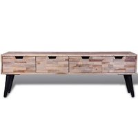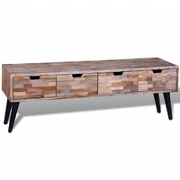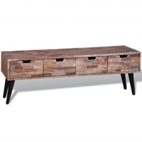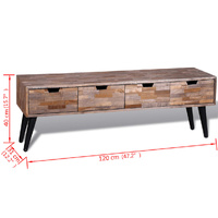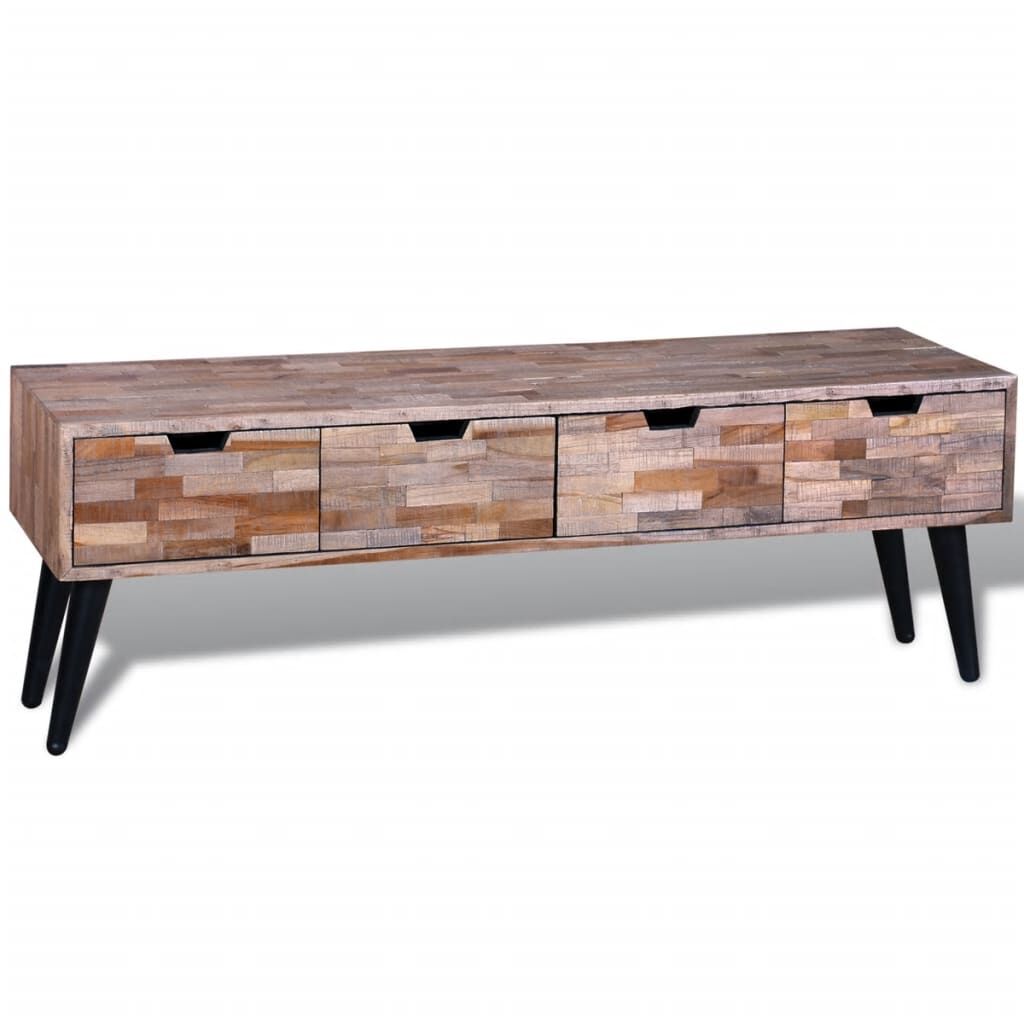 This vintage reclaimed teak TV cabinet is not only stylish, but also very practical with its four spacious storage drawers. It will make great addition to your living room or even bedroom. This TV cabinet is made of reclaimed wood, which means that every piece of furniture is unique and slightly different from the next. Reclaimed wood is solid, stable, durable and beautiful. It is partly handmade, and the craftmanship adds to the unique vintage style of the TV cabinet. Great care is taken at every step of the production process, be it recombining, polishing and painting. Important note: Colours vary from piece to piece, making each of our TV cabinets unique. The delivery is random, ensuring the exclusivity and individuality of your product.