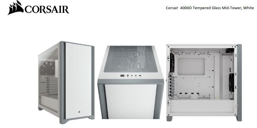 $255.63The CORSAIR 4000D is a distinctive, yet minimalist, mid-tower ATX case with easy cable management and exceptional cooling. A highly durable solid steel front panel and dedicated ventilation channels combine to offer great looks and airflow, accompanied by two included 120mm AirGuide fans that enhance cooling. CORSAIR RapidRoute design makes it effortless to route major cables through a single channel. • Dimensions (L x W x H): 453mm x 230mm x 466mm / 17.83\' x 9.06\' x 18.35\' •Material: Steel, Plastic, Tempered Glass • Cooling Layout: Top: 2x 120mm, 2x 140mm Front: 3x 120mm, 2x 140mm (1x 120mm Included) Rear: 120mm (1x 120mm Included) Radiator Front: 360mm / 280mm Top: 280mm with CORSAIR LPX DRAM / 240mm with all CORSAIR DRAM Rear: 120mm PCI Slots 7 + 2 Vertical