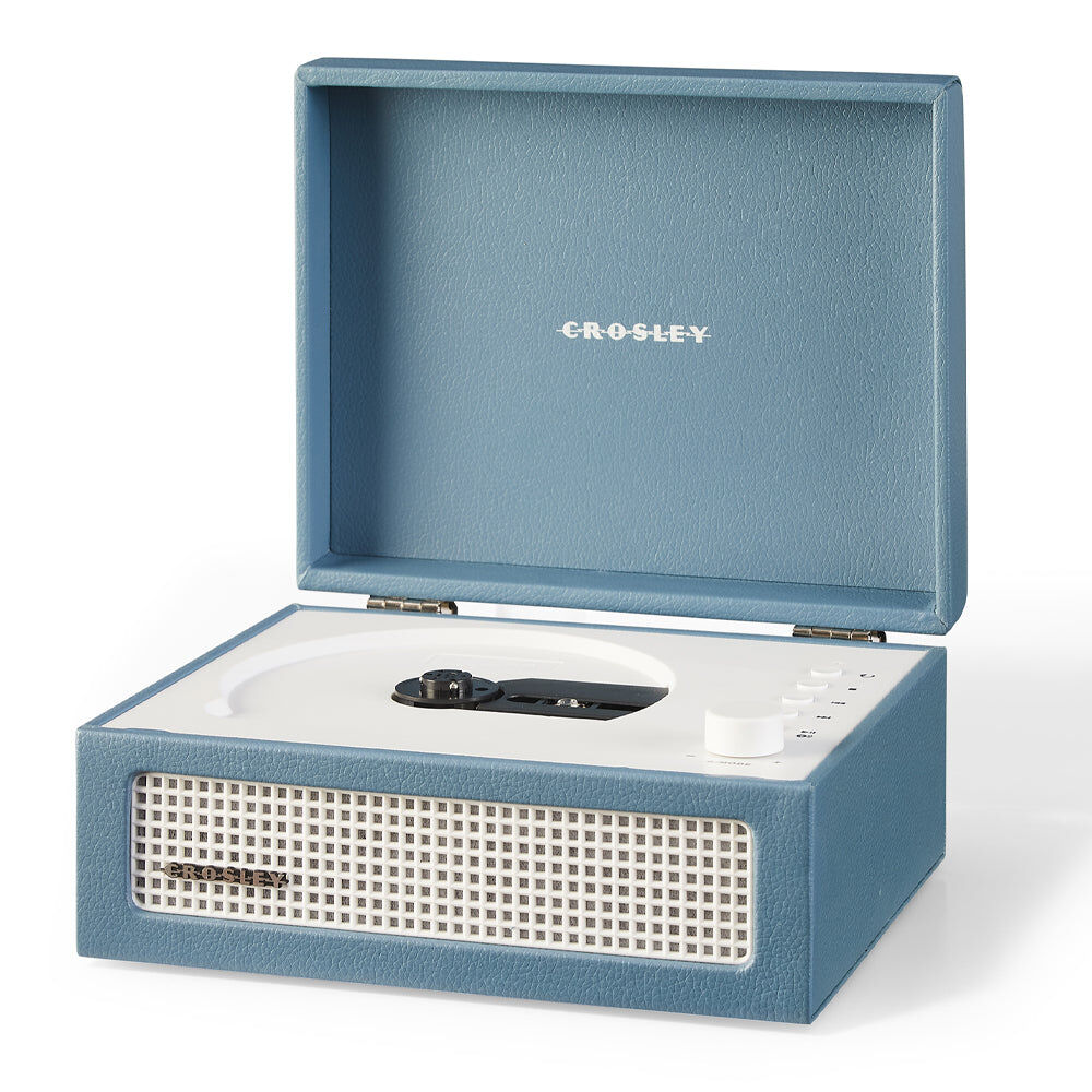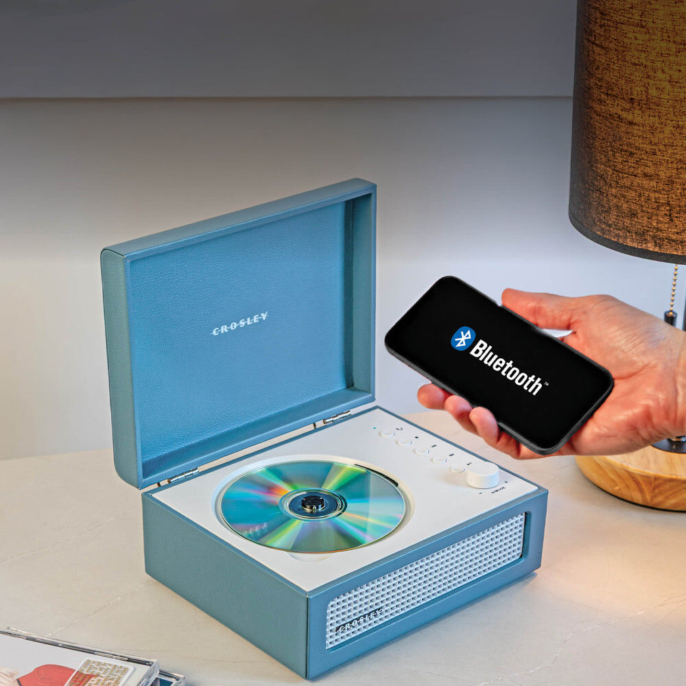 Crosley Voyager Portable Retro CD Player with Stereo Bluetooth Speakers, FM Radio - Washed Blue - It may look like a mini turntable, but the Voyager CD Player is designed for a different kind of spin — your favourite CDs. Combining retro charm with modern functionality, this compact player delivers style and sound wherever you go.